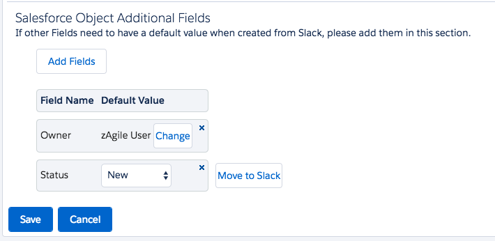 The second set consists of additional fields that will not be presented or made visible to the Slack User during the creation. However, these fields may be populated using default values to provide additional data to the object being created, as shown in this example: