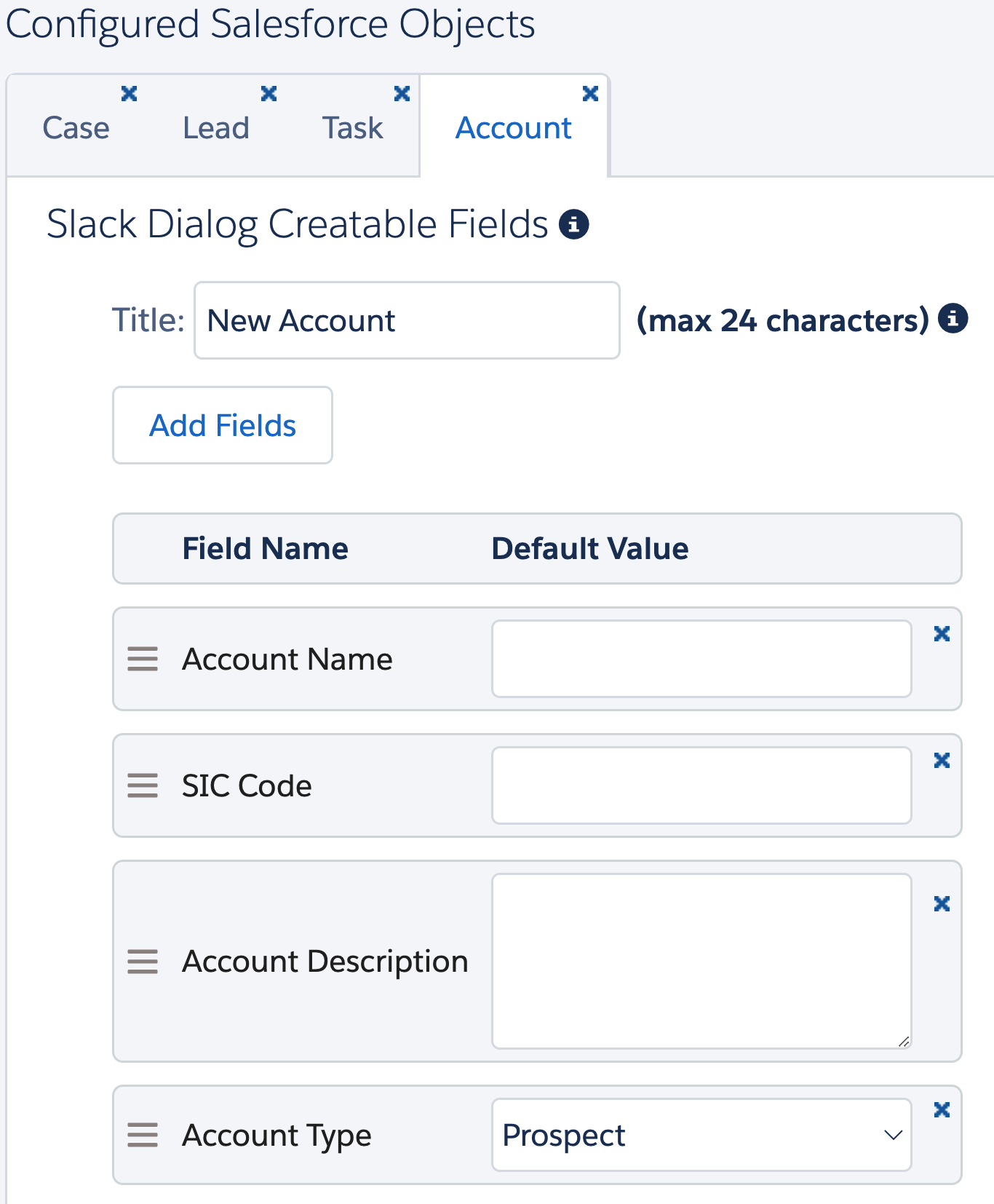 In this example, the following fields were configured to create a new Salesforce Account from Slack: