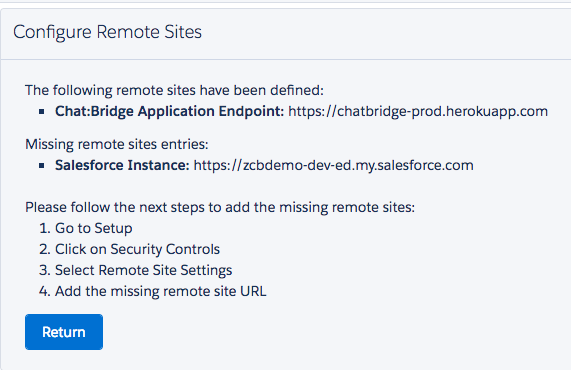 This step will check whether the required Remote Sites have been added to enable outbound communications by Chat:Bridge. The first one in the list below is automatically added by the package install script. The second is a prerequisite to the installation steps, mentioned previously. In the example below, it specifies the Salesforce org in which Chat:Bridge package is being installed.