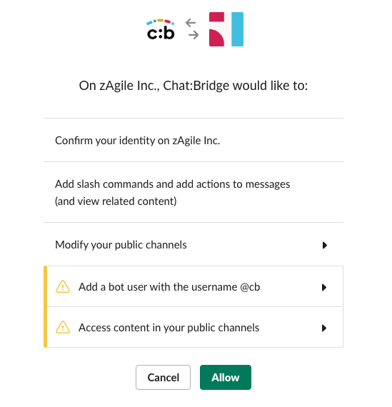 This step guides you thru the installation of the Chat:Bridge Slack app which will be used to communicate between Chatter and Slack. Once you select this option, you will have 30 minutes to add the Chat:Bridge Slack app to the desired Slack team. By clicking on the ‘Add to Slack’ button on the right, you will be redirected to a page that lists the operations for which Chat:Bridge requests your authorization (screenshot of partial list below).
