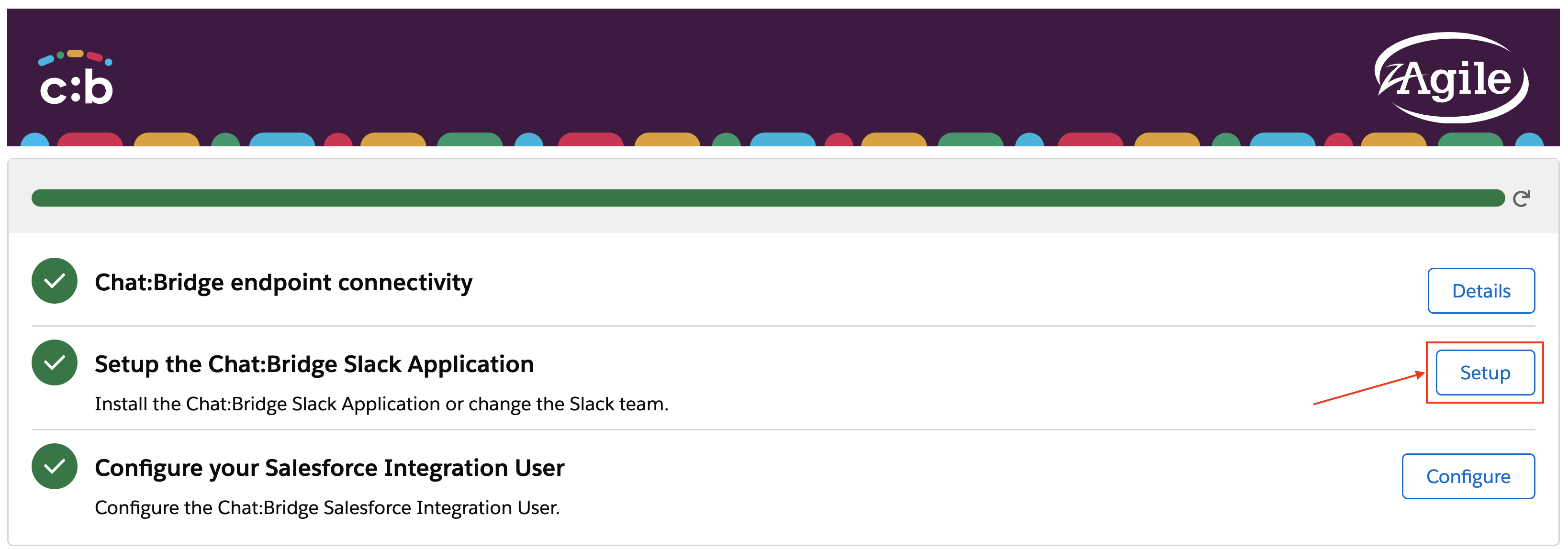 In the Chat:Bridge Salesforce Package configuration page, click on the Setup button for the Setup Chat:Bridge Slack Application section, then expand the section Authorize a different Slack User to click on the Add to Slack button. This will initiate the Slack Application re-authorization process to update the Chat:Bridge Slack Application