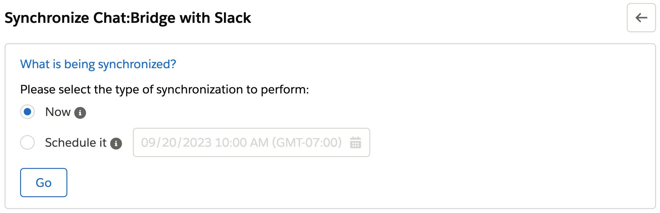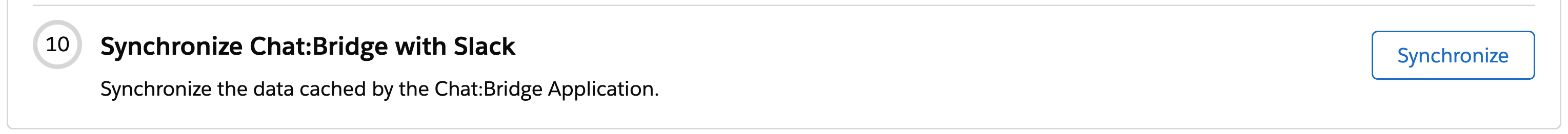 In the Chat:Bridge Salesforce Package configuration page, click on the Synchronize button in section 10. Synchronize Chat:Bridge with Slack, then request to perform a synchronization by selecting Now and clicking on the Go button. Once the synchronization process is complete, a summary with the details will be displayed