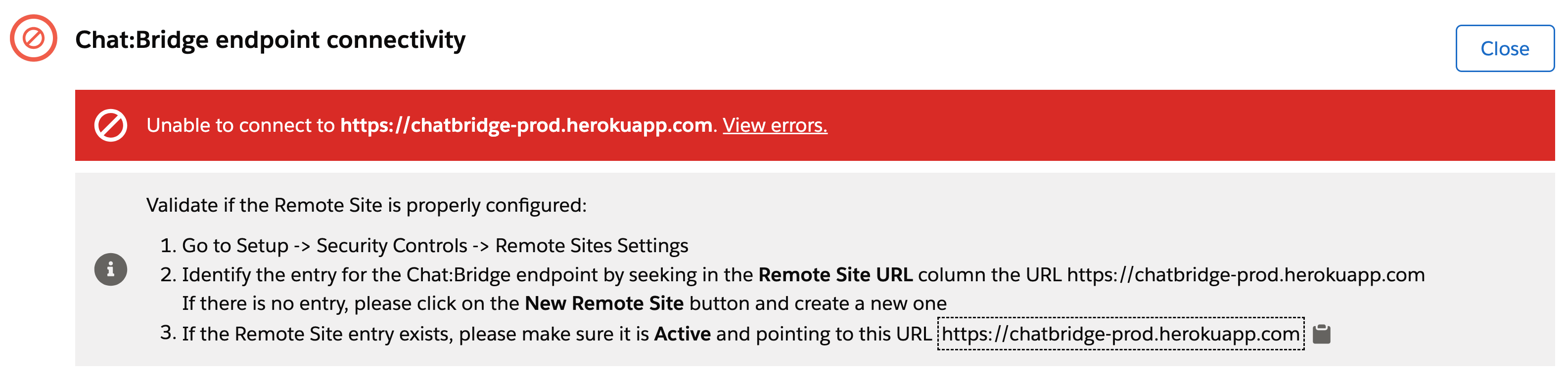 This step will check whether the required Remote Sites have been added to enable outbound communications by Chat:Bridge. The first one in the list below is automatically added by the package install script. The second is a prerequisite to the installation steps, mentioned previously. In the example below, it specifies the Salesforce org in which Chat:Bridge package is being installed.
