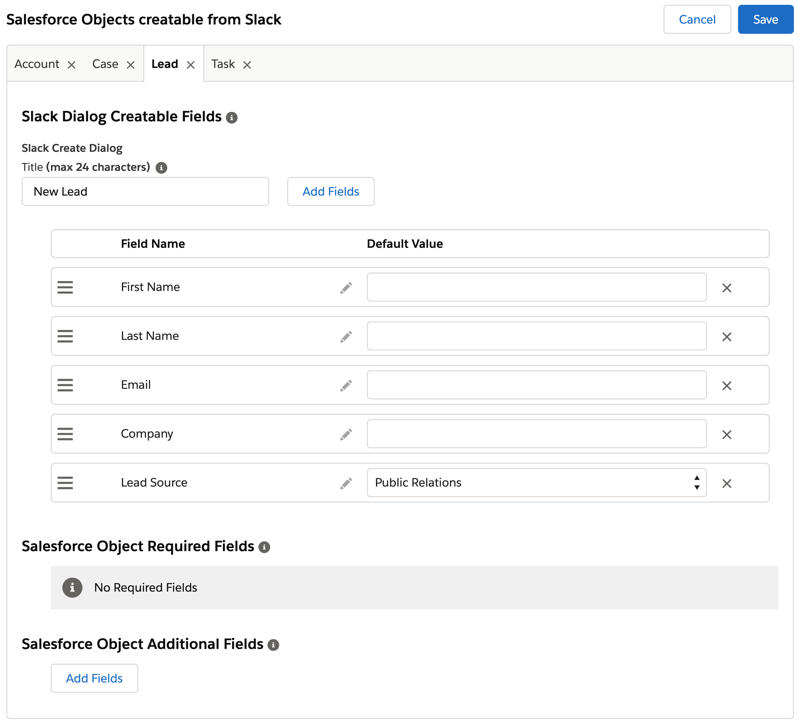 You can add up to 5 fields to the Slack dialog using the Add Fields button. You can also select additional fields that may be prepopulated through default values when creating the object beyond the 5 that will be shown in the Slack dialog. These additional fields will be populated by Chat:Bridge based on the values specified in this configuration.
