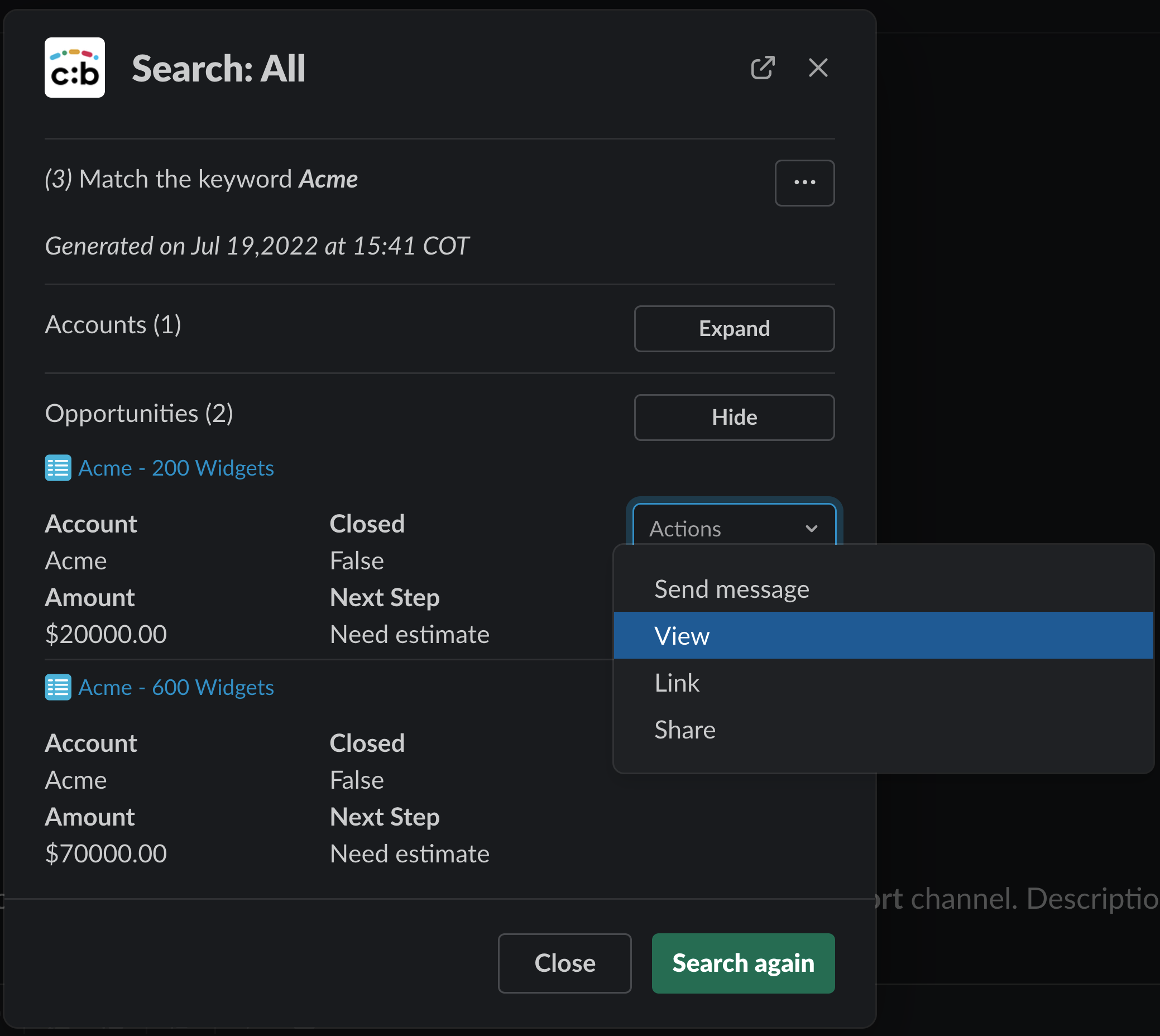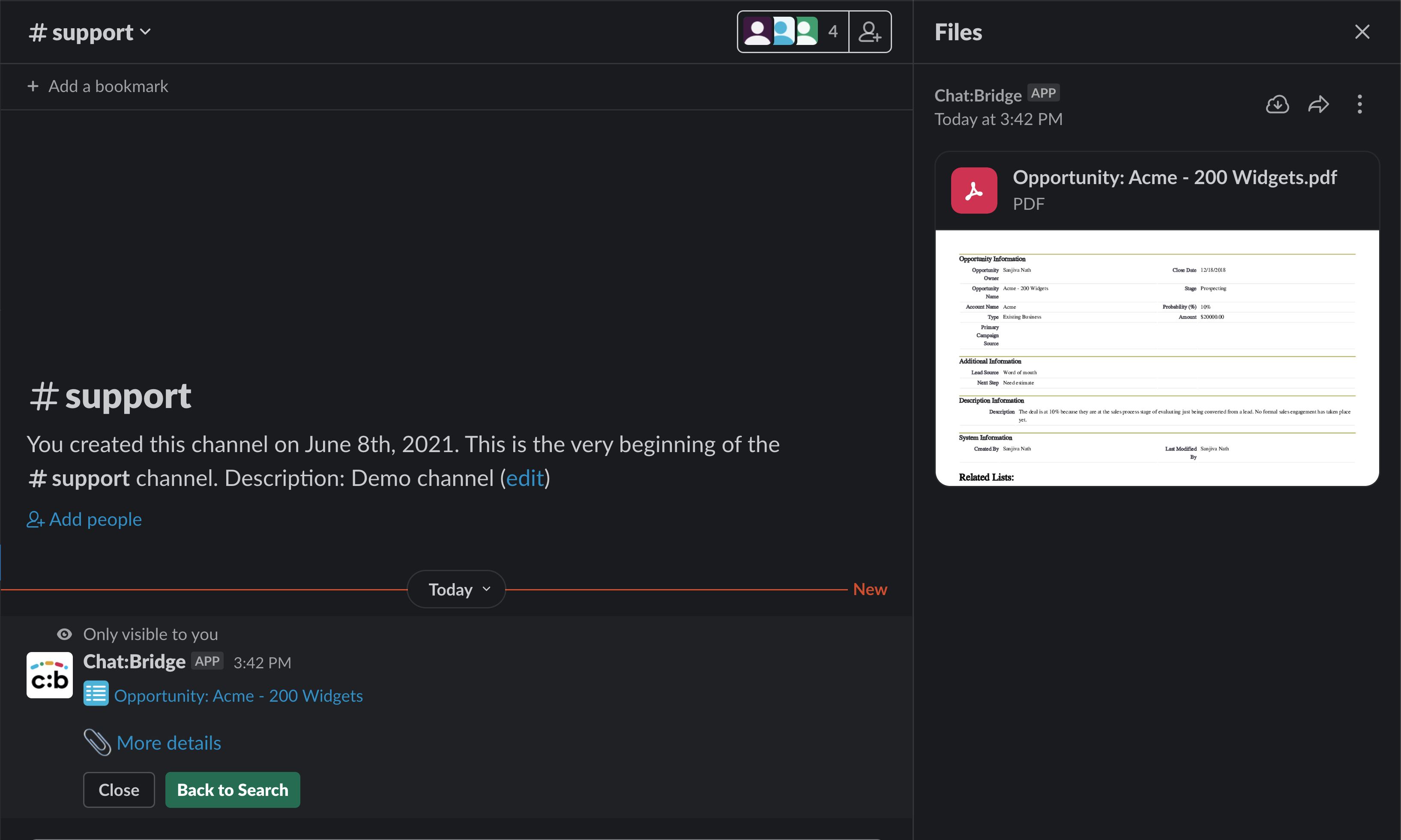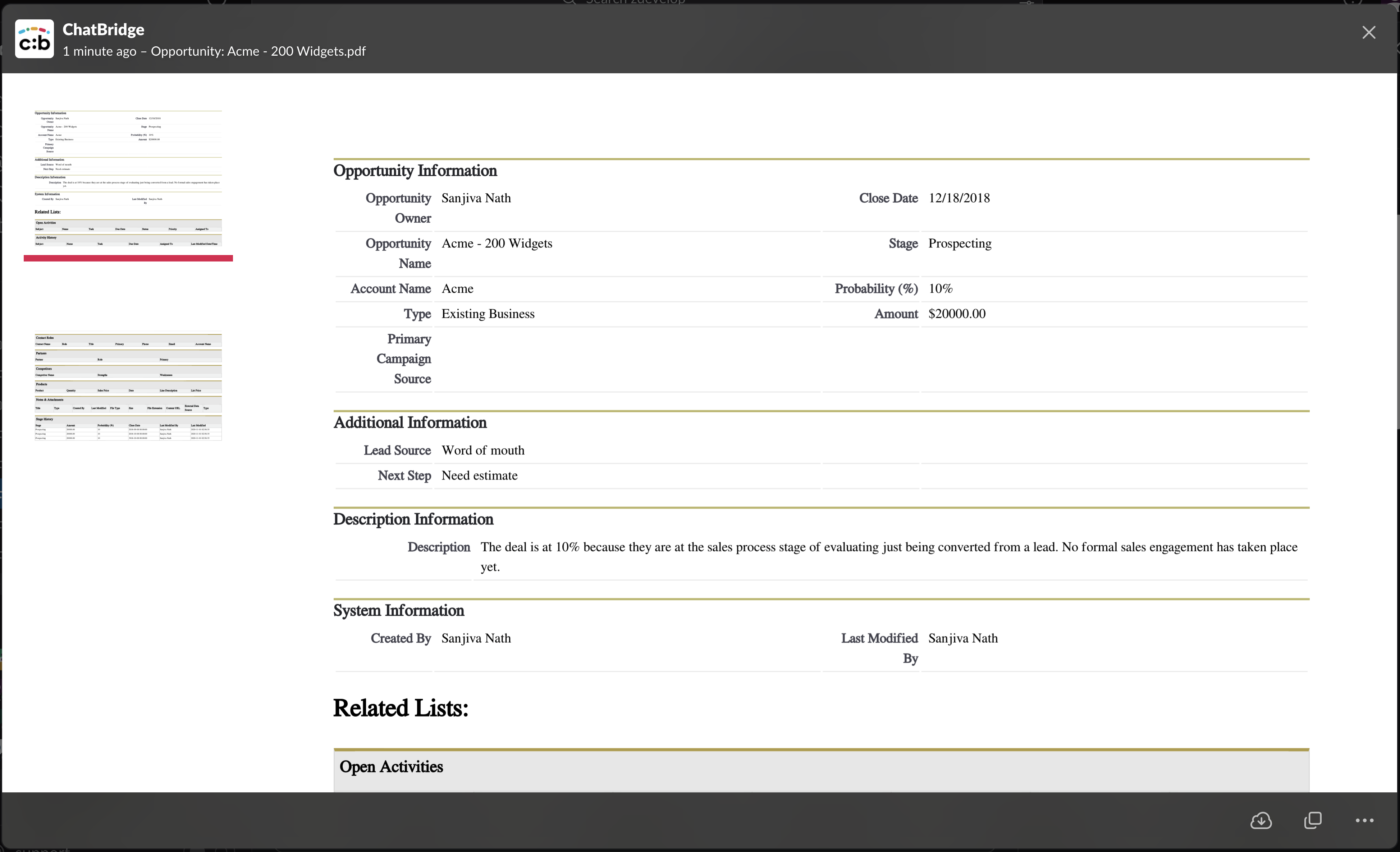 In the previous example, /sf provides a list of Salesforce Objects that match the string provided as a parameter. From this list, you can choose the specific Object to which you want to publish a message (send to its Chatter Feed), or you can retrieve more details about the Object. The View option will retrieve the configured page layout for that object in the form of a PDF file. The page layout configured in Salesforce for this purpose allows you to control specific fields and related lists that are accessible to Slack Users via this command.