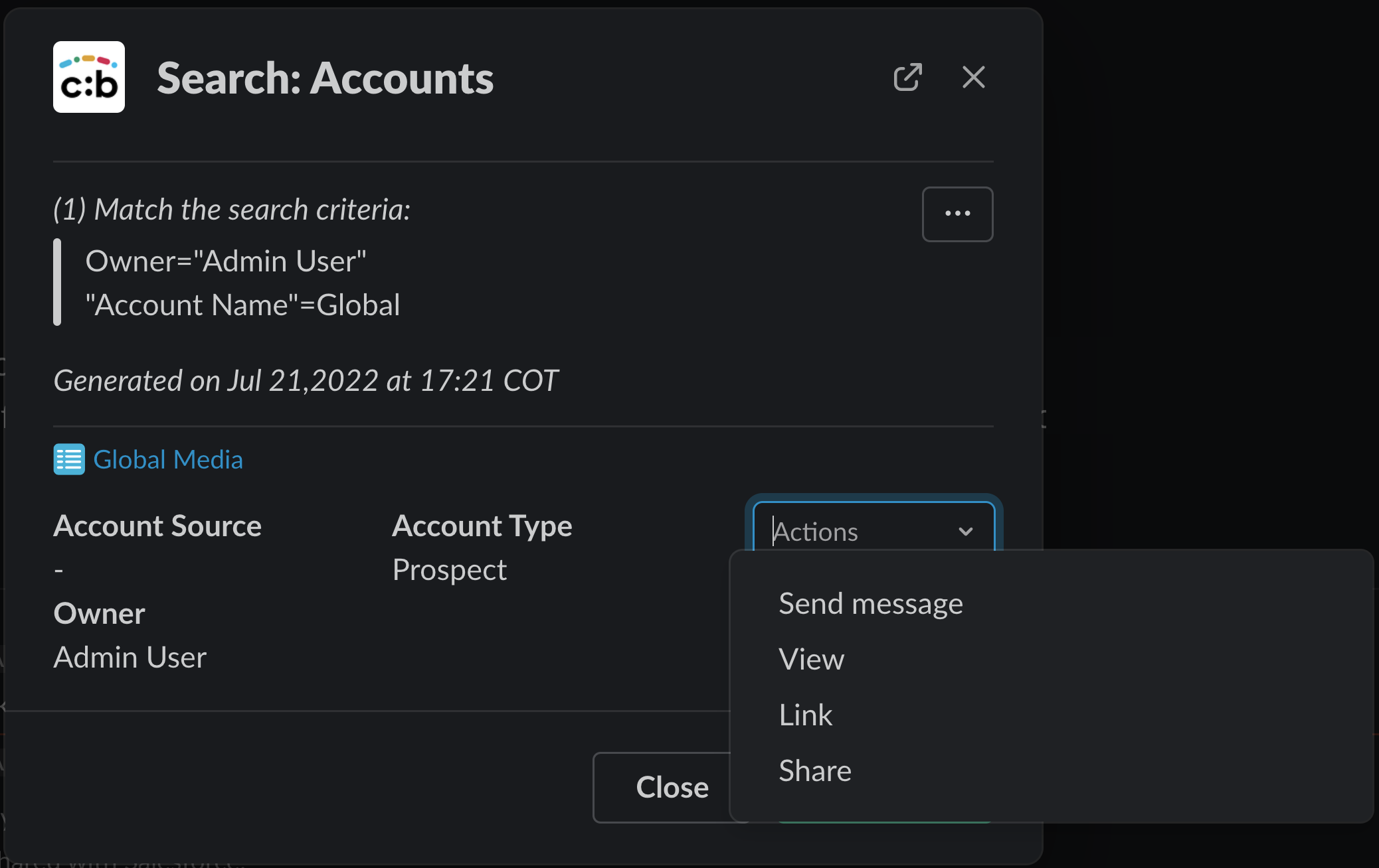 Further actions (Send Message to the Account, View Account details, Link the Account to the current Slack Channel and Share the Account with the Slack channel) are available via the pull down on the right of the result set.