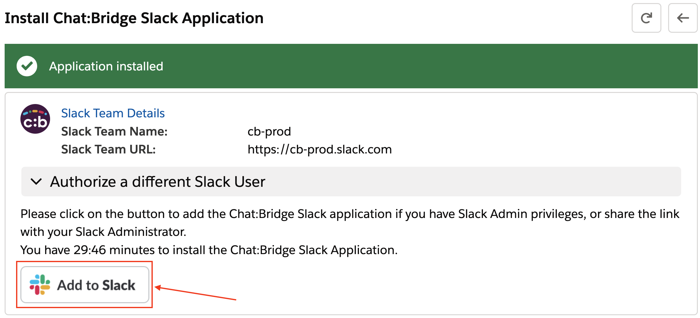 In the Chat:Bridge Salesforce Package configuration page, click on the Setup button for the Setup Chat:Bridge Slack Application section, then expand the section Authorize a different Slack User to click on the Add to Slack button. This will initiate the Slack Application re-authorization process to update the Chat:Bridge Slack Application