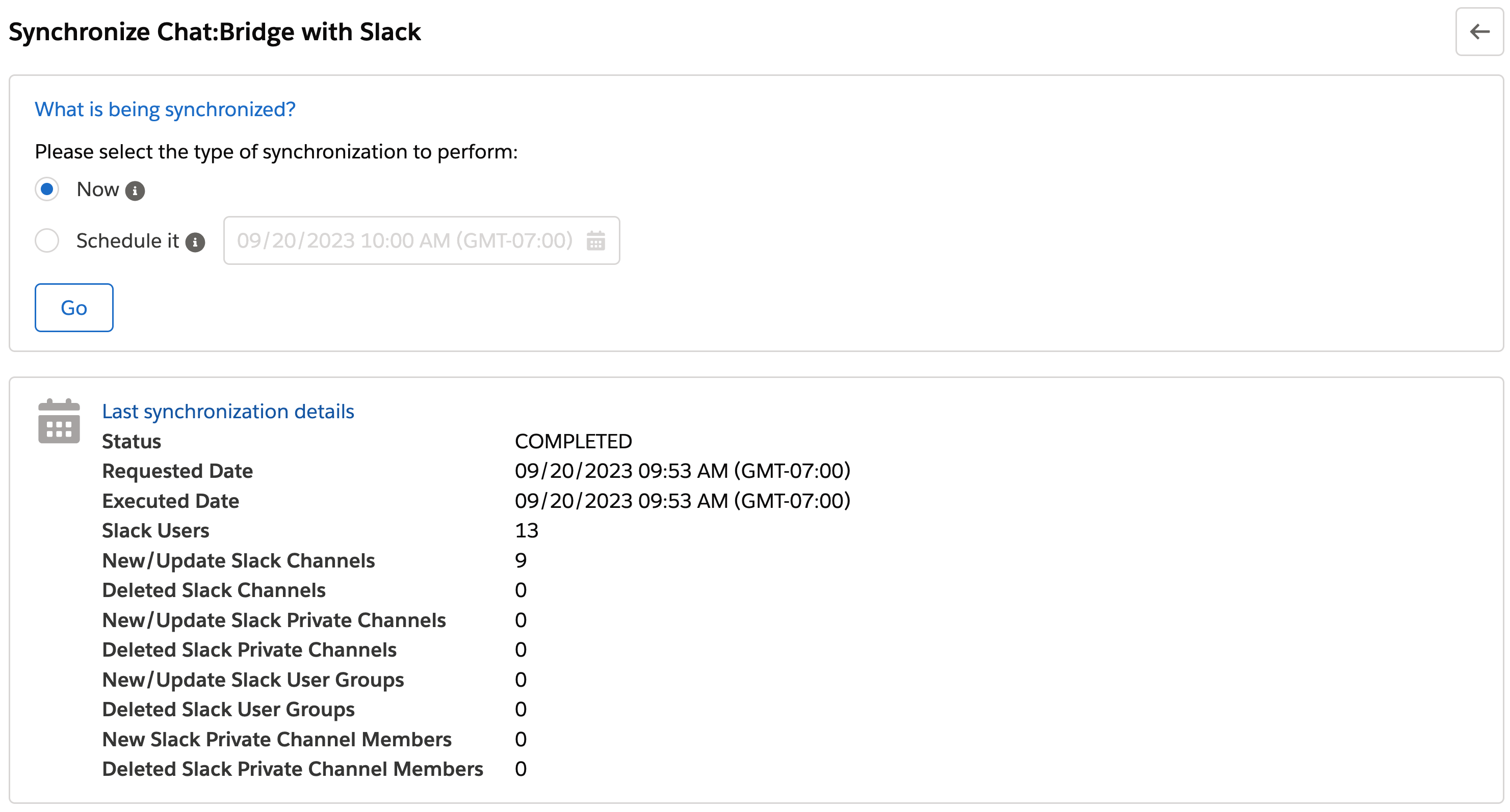 In the Chat:Bridge Salesforce Package configuration page, click on the Synchronize button in section 10. Synchronize Chat:Bridge with Slack, then request to perform a synchronization by selecting Now and clicking on the Go button. Once the synchronization process is complete, a summary with the details will be displayed