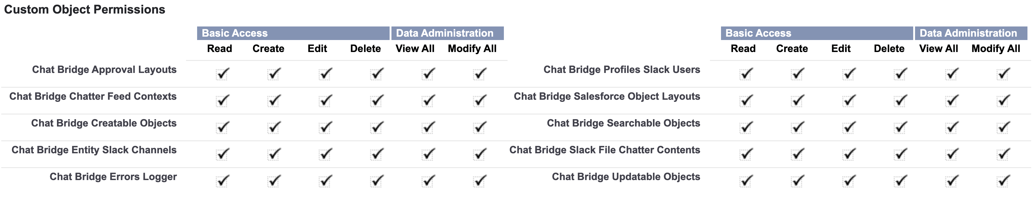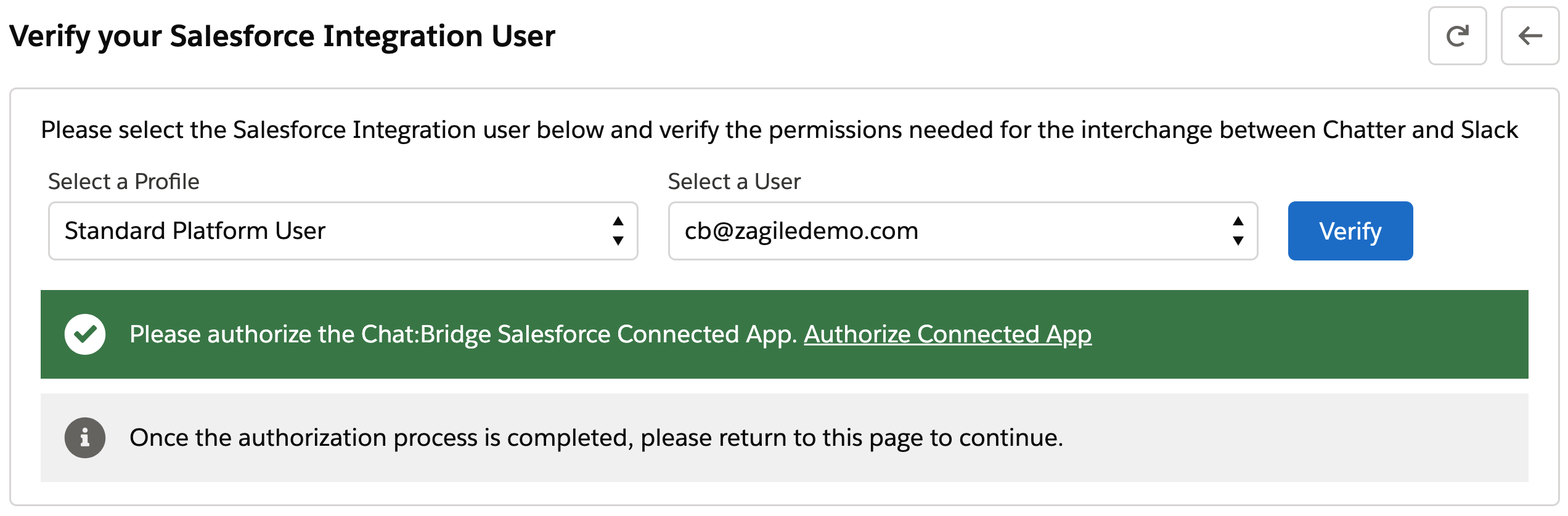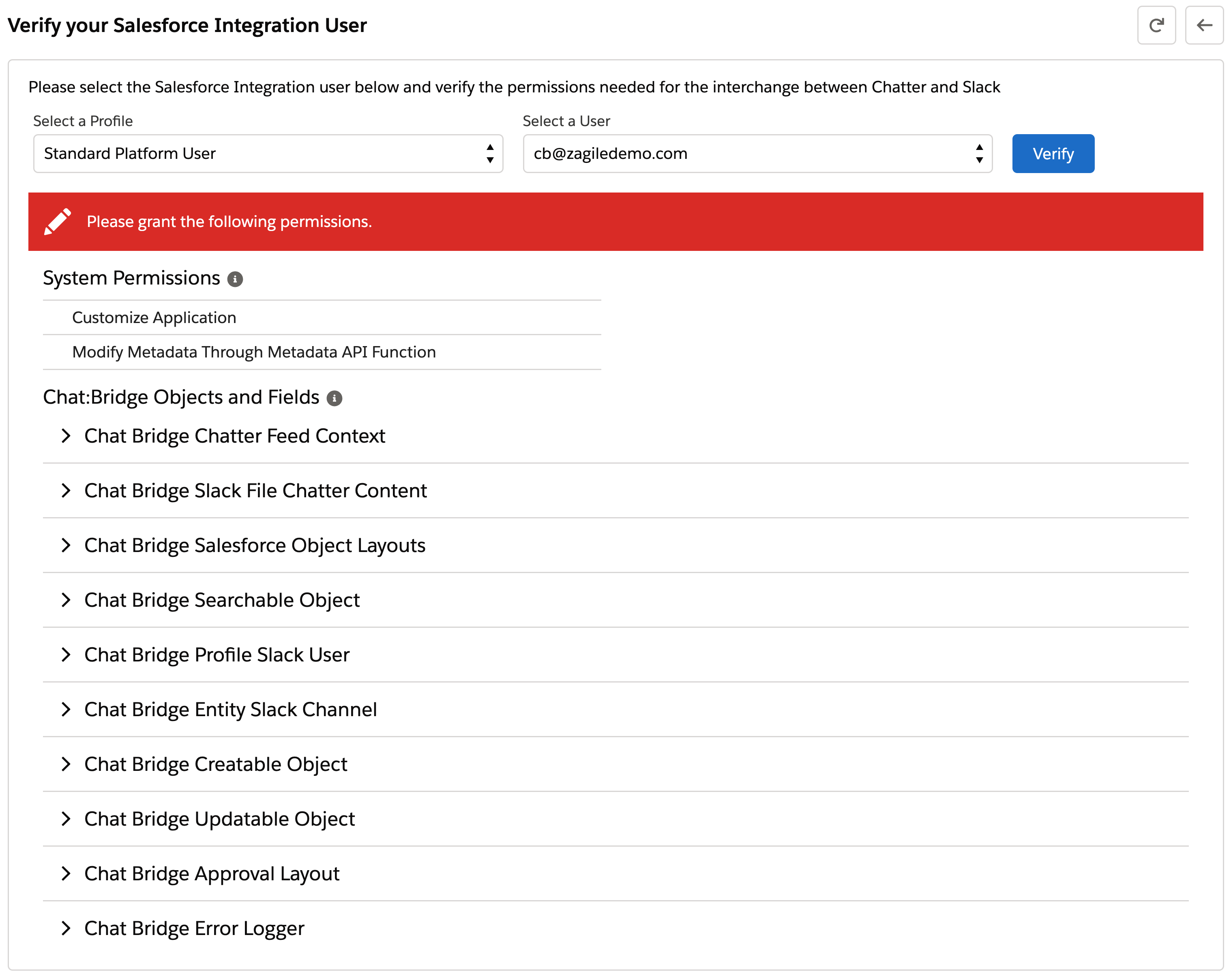 This step verifies the permissions needed by the Salesforce Integration User account that you intend to use for messaging and other actions from Slack. Missing permissions will be indicated during the verification so that you can configure them as required by Chat:Bridge.