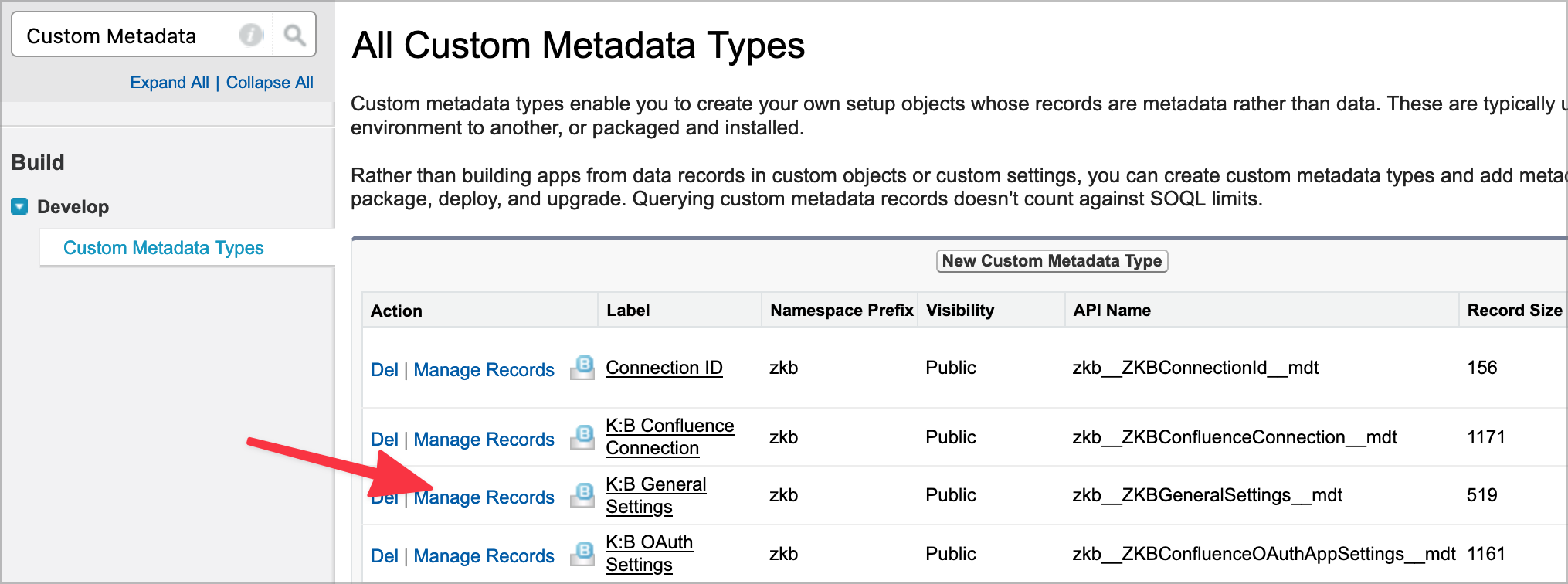 In Custom Metadata Types in Salesforce Setup, find the K:B General Settings and click on Manage Records,
