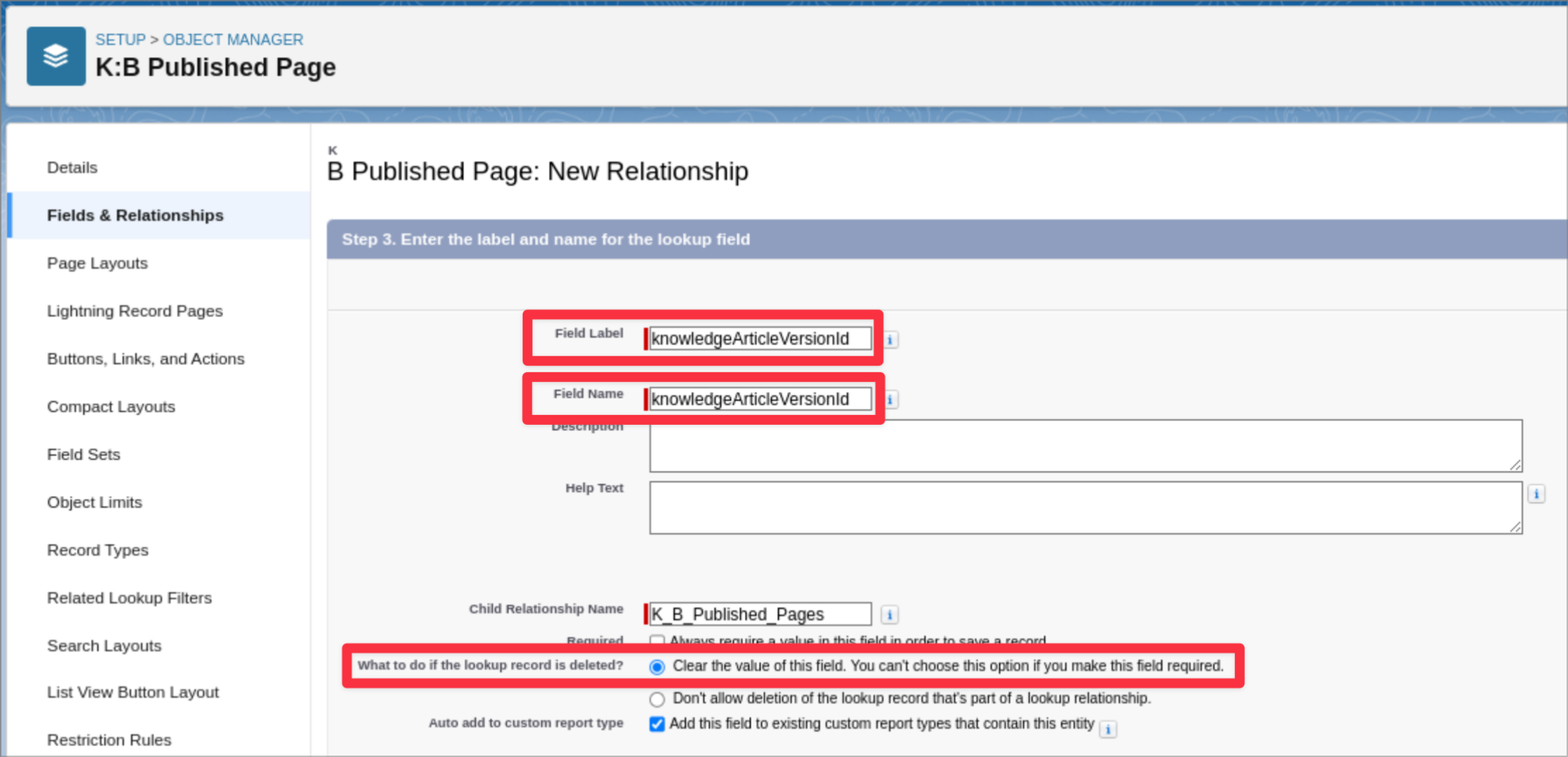 What to do if the lookup record is deleted?: Clear the value of this field.