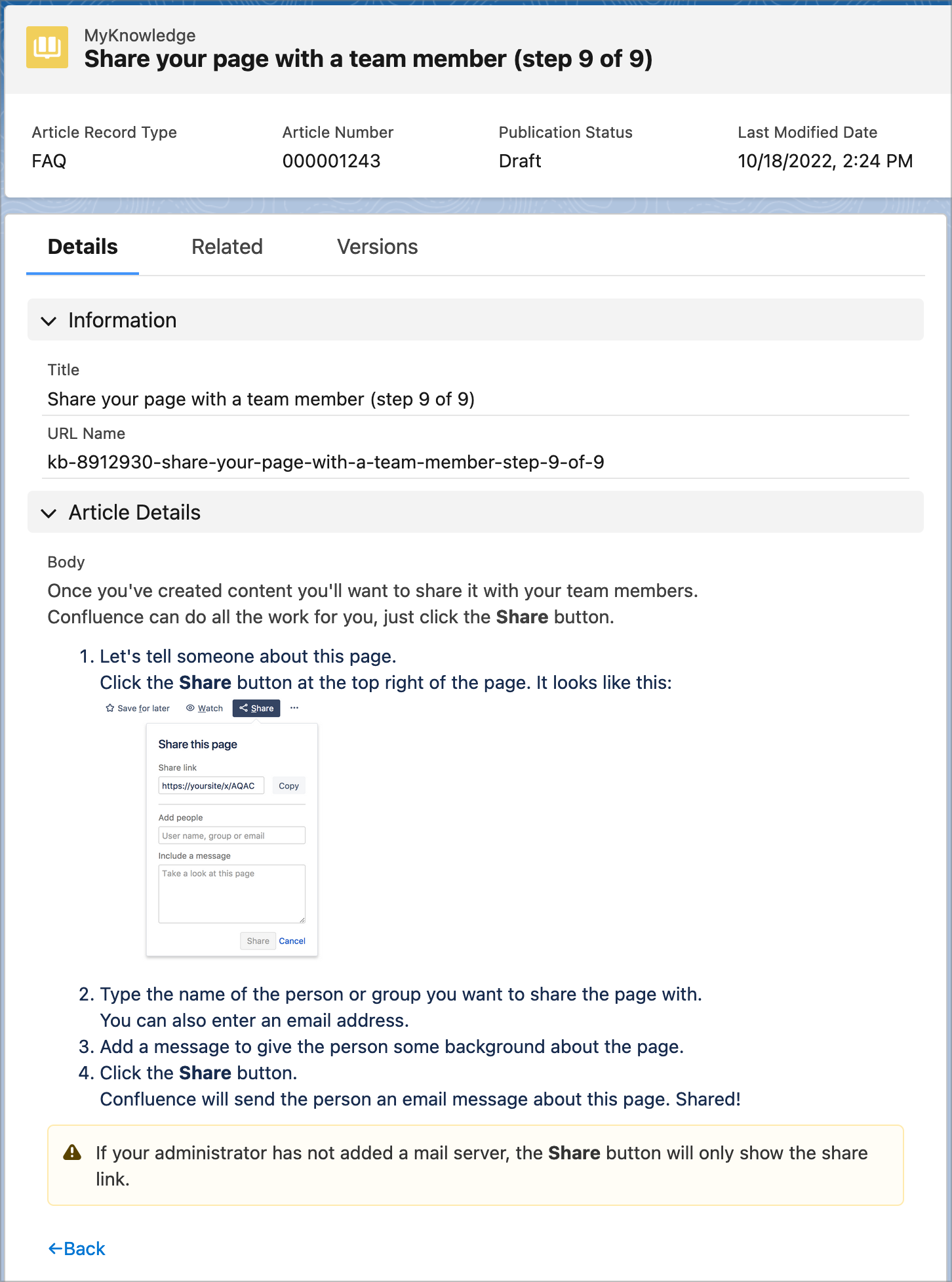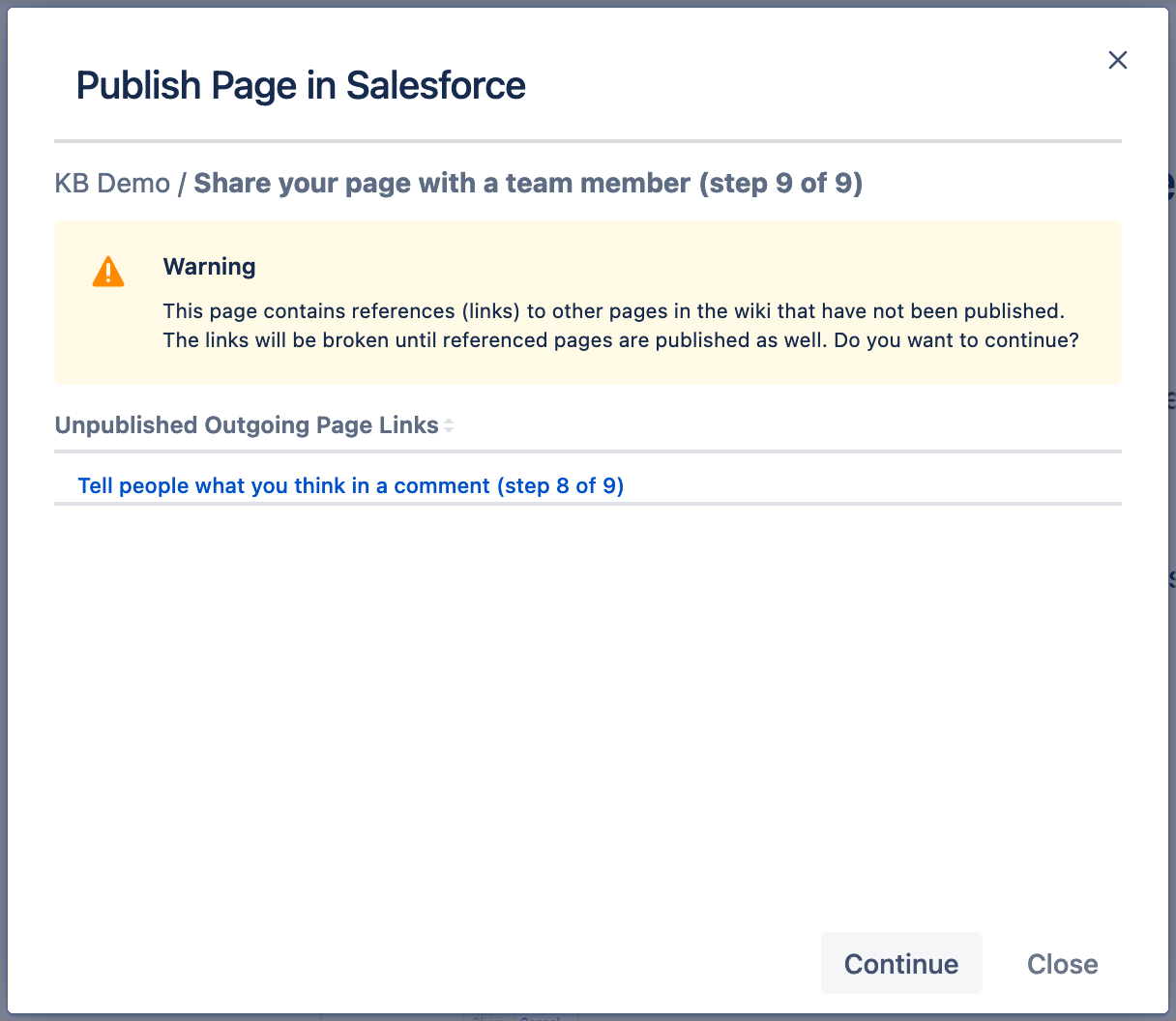 If the page being published has references (links) to other pages in Confluence not yet published in Salesforce, these references are flagged. In such scenarios, the link to the corresponding page will navigate to a non existing Knowledge Article in Salesforce. Alternatively, you can choose to publish all of those pages to Salesforce before or after continuing.
