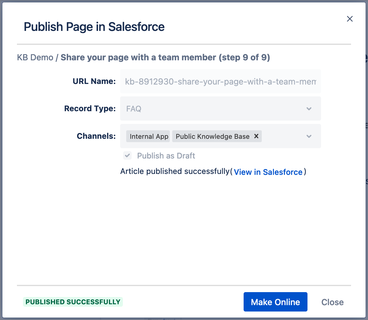 If you choose to publish the page in Draft mode, you may review the published Article in Salesforce via the 'View in Salesforce' link provided, as well as, make the Article Online. It is recommended to review the draft Article in Salesforce prior to making it Online and available to Internal Salesforce Users or public Sites.