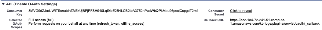Once created, the Consumer Key and Consumer Secret must be copied/pasted into the Salesforce OAuth Credentials configuration option of Knowledge:Bridge add-on in Confluence (shown below).