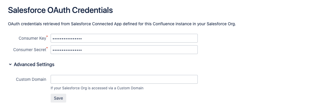 - Copy Consumer Key and Consumer Secret from this Connected App into corresponding configuration in Confluence