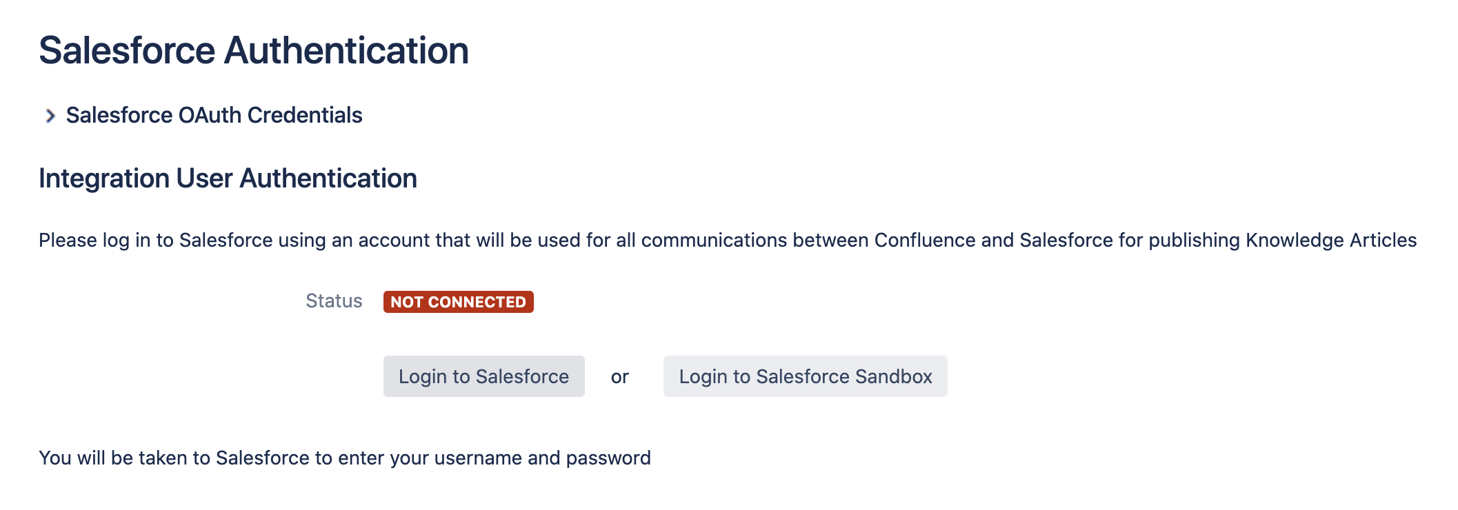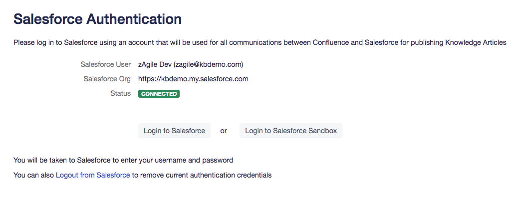 Once the credentials are saved in the steps above, the next step is to log in to Salesforce using an account that will be used for publishing Confluence pages to Salesforce Knowledge Articles.