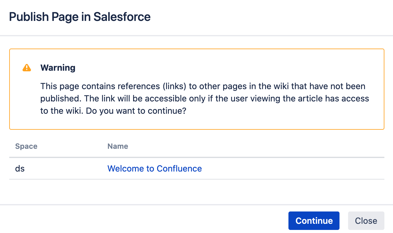 If the page being published has references (links) to other pages in Confluence not yet published in Salesforce, these references are flagged. In such scenarios, the link to the corresponding page in Confluence is published. Alternatively, you can choose to publish all of those pages to Salesforce before continuing.