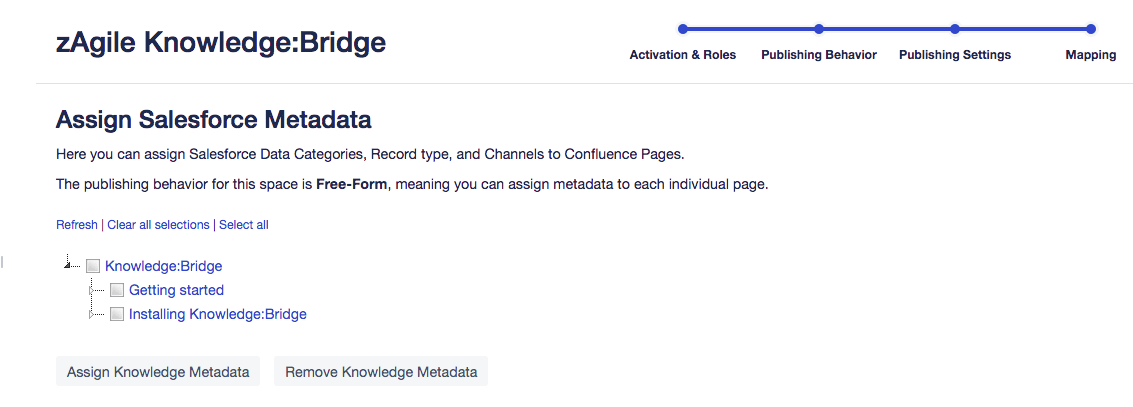3. Article Metadata – Associating Salesforce data categories, record types, and channels with Confluence pages to be published to Salesforce. This may be done at the page level.