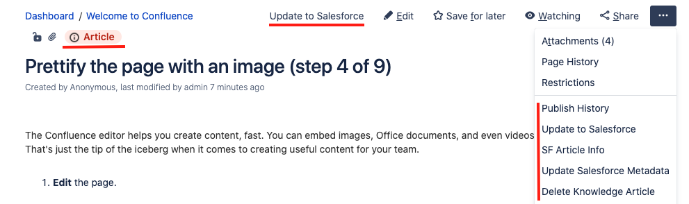 The ‘Update to Salesforce’ button on the page header allows you to update a Salesforce Knowledge Article from the Confluence page from which it was initially published.