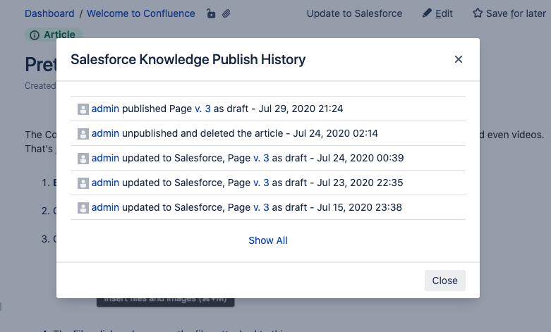 Publish History – Reflects the publishing activity performed on the page for posting as Salesforce Knowledge Article