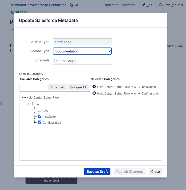 Once a Confluence page has been posted to Salesforce as Knowledge Article, either in draft mode or published mode (visible in selected channels), its reference to the article from Salesforce (Article ID, URL), along with local metadata, are stored in the Confluence page properties.
