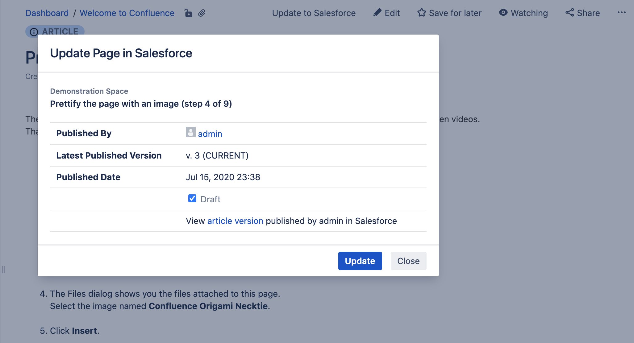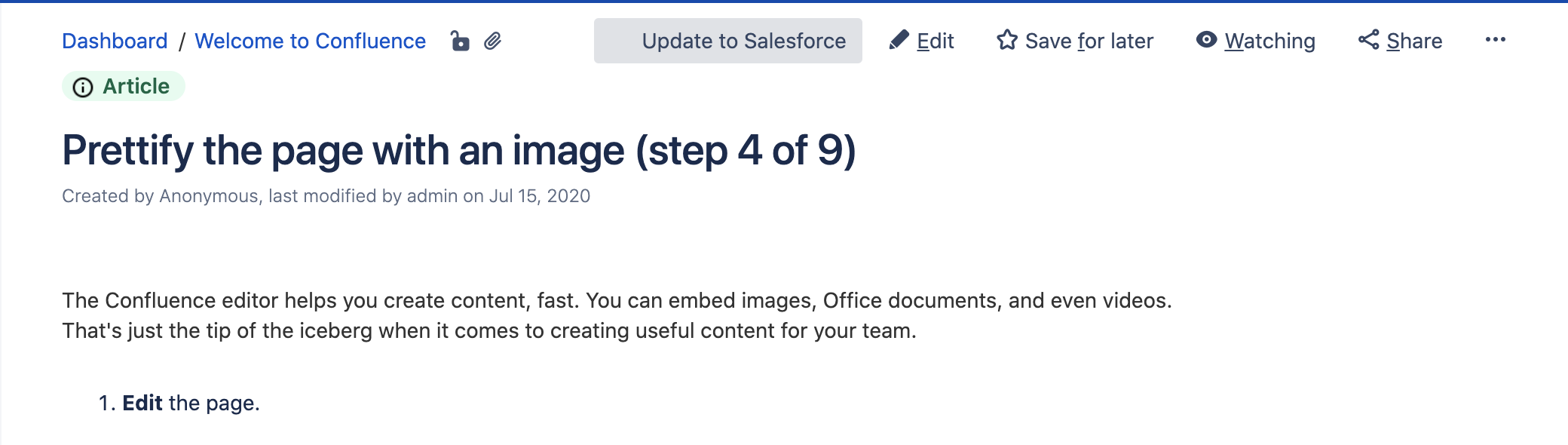 The page is also marked as published to Salesforce and transitioned to ‘Update to Salesforce’ state (shown below). This allows for subsequent updates to the Article as the page undergoes revisions and updates in Confluence.