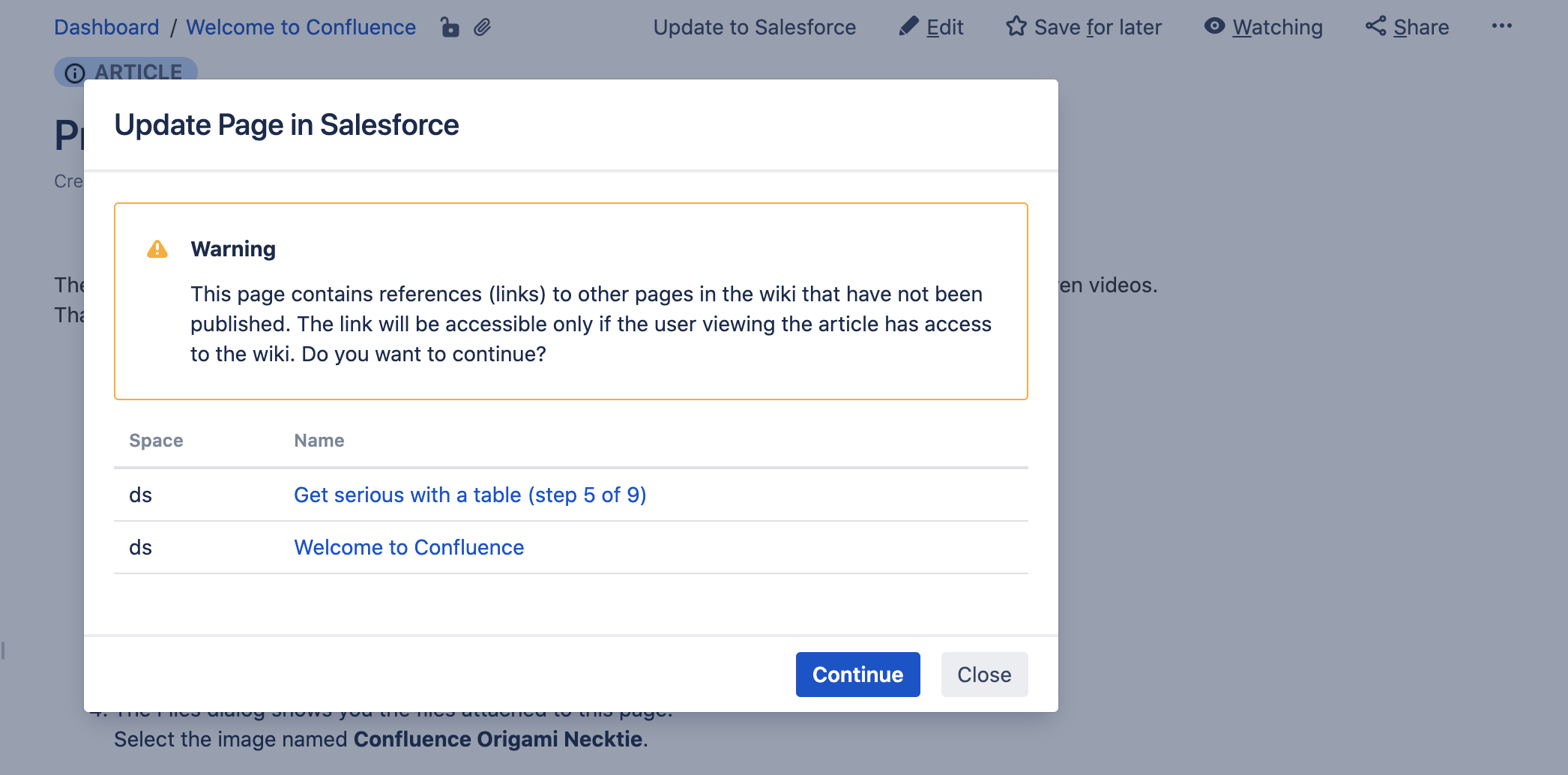 It also scans the page for any links to other Confluence pages that may not have been published. If you continue, these links to Confluence pages will be retained in the content published to Salesforce and only users who have access to these pages in Confluence will be able to navigate to them. This scan gives you the option to resolve the links/references prior to initially publishing or updating the Article. If the referenced pages have previously been published to Salesforce as Knowledge Articles, Knowledge:Bridge will replace these links with the corresponding ones in Salesforce.