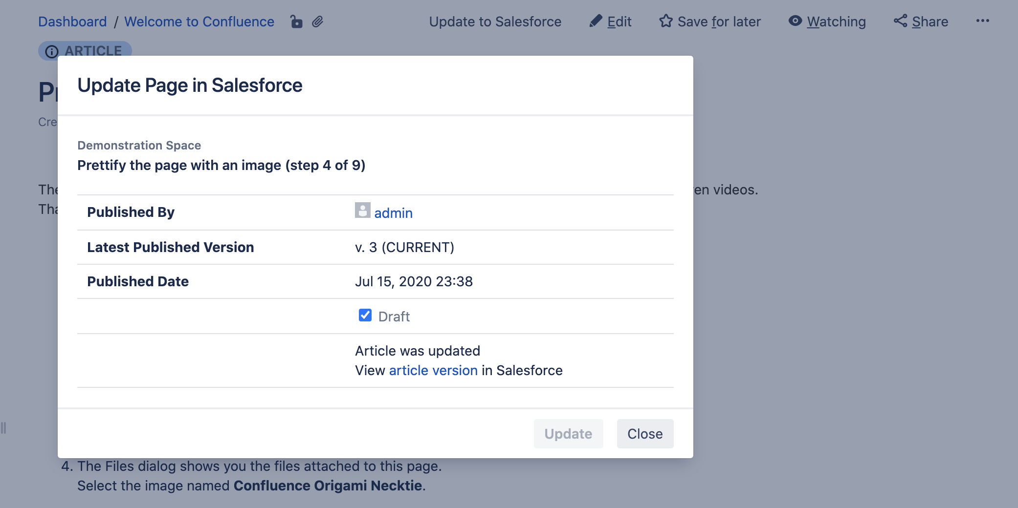 Finally, when the corresponding Salesforce Article is updated from this page, a pop up provides the confirmation, along with additional details.