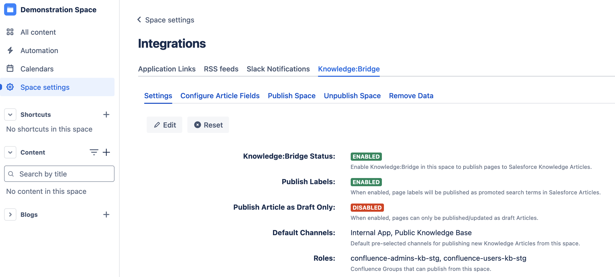 Enable the Space for publishing pages to Salesforce Knowledge Articles