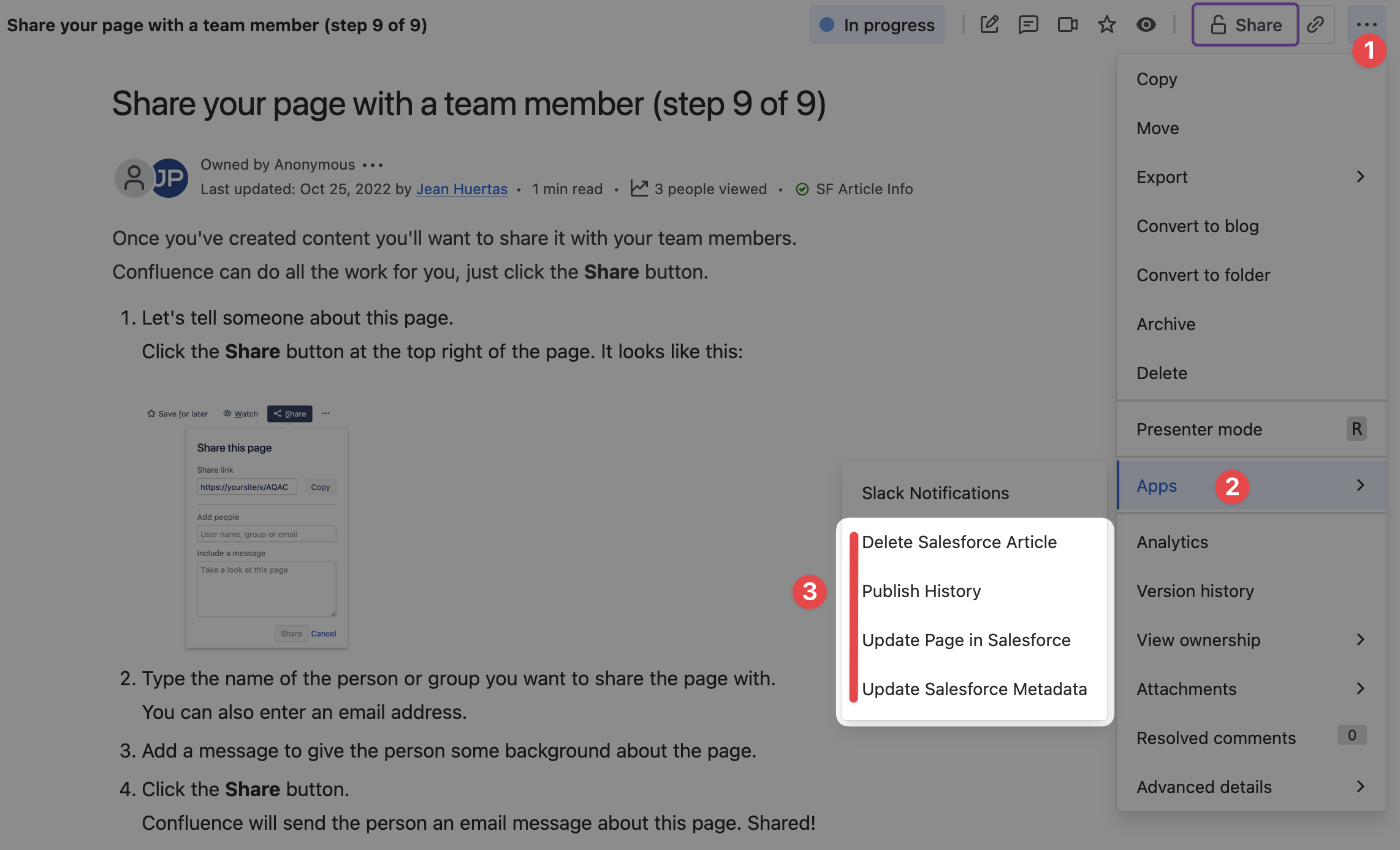 Once a Confluence page has been posted to Salesforce as Knowledge Article, either in draft mode or published mode (visible in selected channels), its reference to the Article from Salesforce (Article ID, URL) are stored in the Confluence page properties.