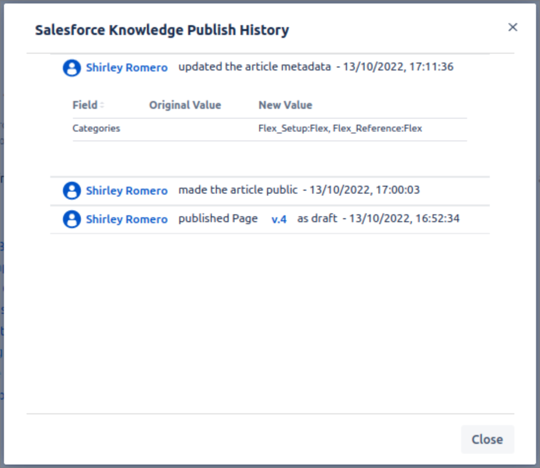 Publish History – Reflects the publishing activity performed on the page for posting as Salesforce Knowledge Article