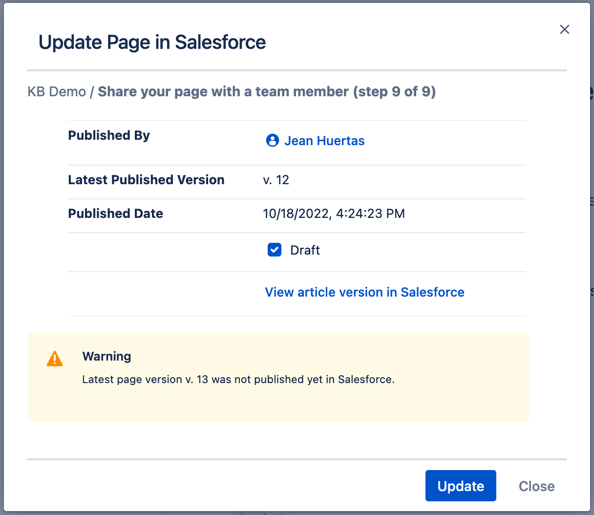 Finally, when the corresponding Salesforce Article is updated from this page, a pop up provides the confirmation, along with additional details and a link to view the article in Salesforce.