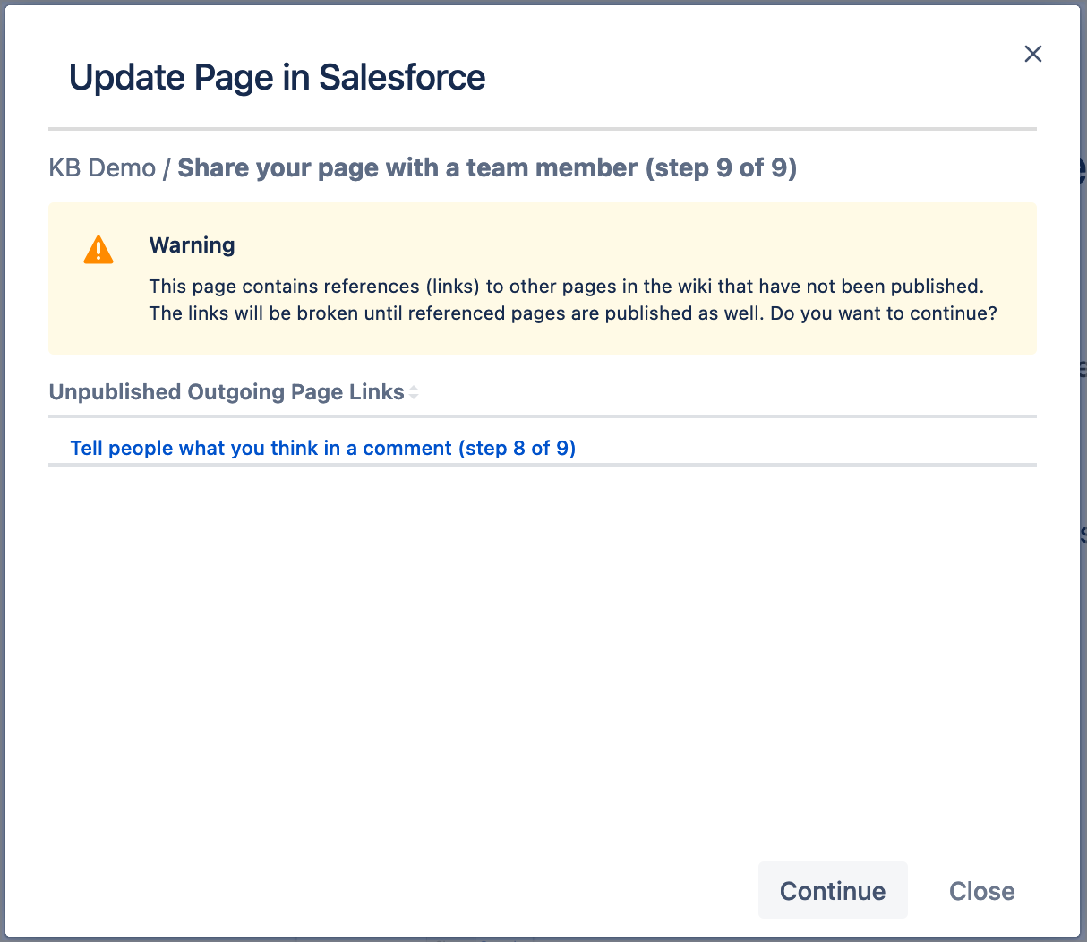 After clicking on Update it will scan the page for any links to other Confluence pages that may not have been published. If you continue, these links will point to yet non existing Salesforce Articles (these links will work properly once you publish the referenced pages). This scan gives you the option to resolve the links/references prior updating the Article.