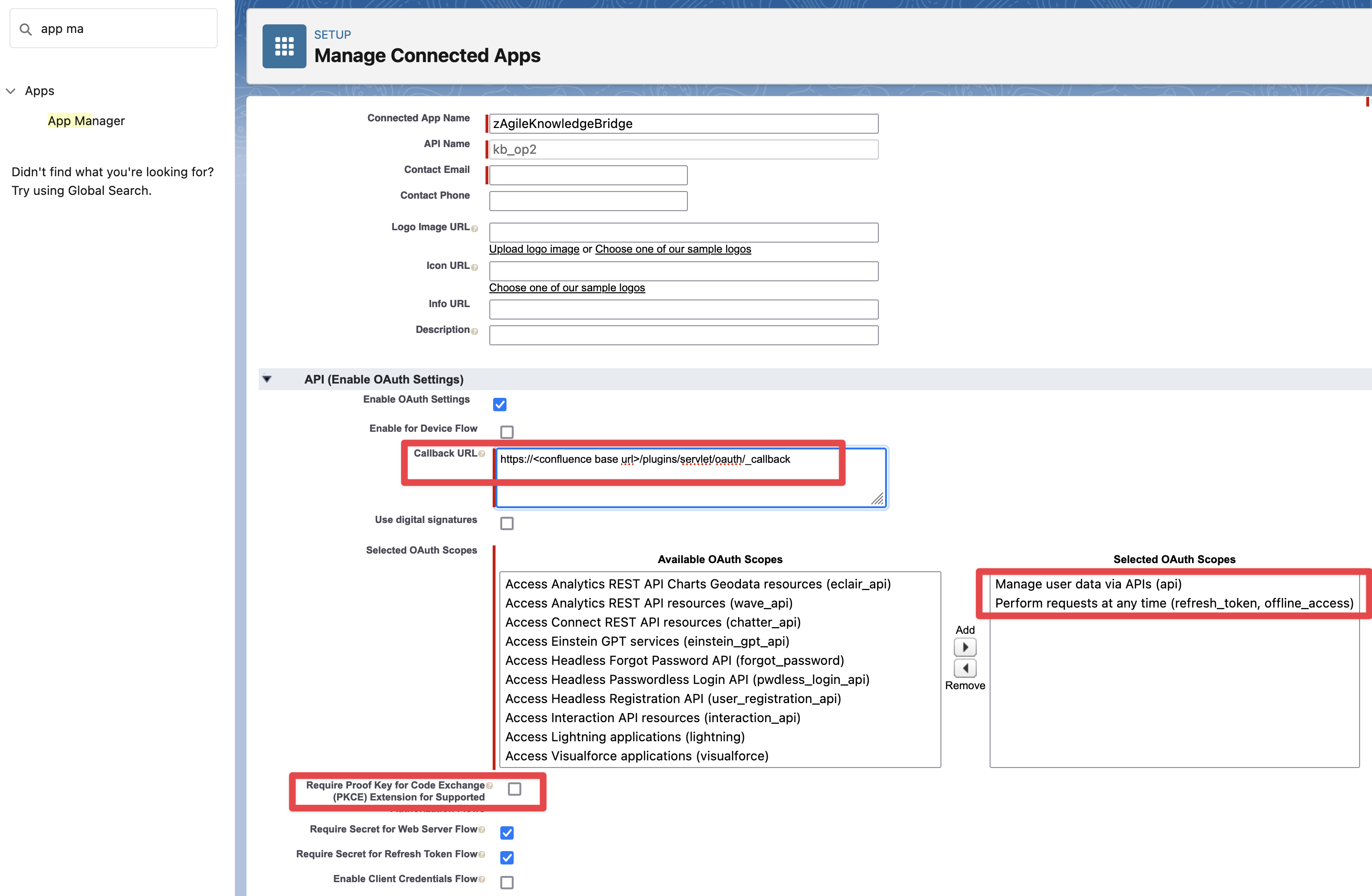 - Copy Consumer Key and Consumer Secret from this Connected App into corresponding configuration in Confluence
