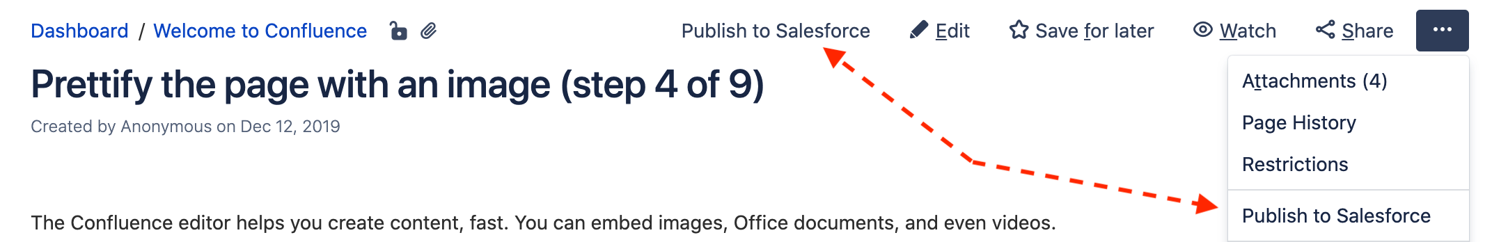 Once the Confluence space is enabled for publishing to Salesforce Knowledge, each page will display ‘Publish to Salesforce’ option in the header, as well as, the menu, as shown below.
