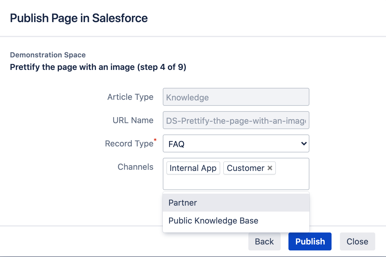 If the page being published has references (links) to other pages in Confluence not yet published in Salesforce, these references are flagged. In such scenarios, the link to the corresponding page in Confluence is published. Alternatively, you can choose to publish all of those pages to Salesforce before continuing.