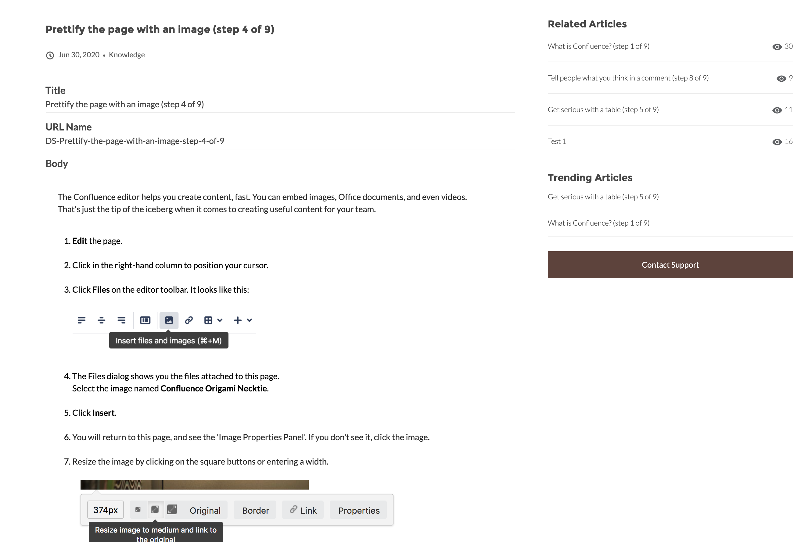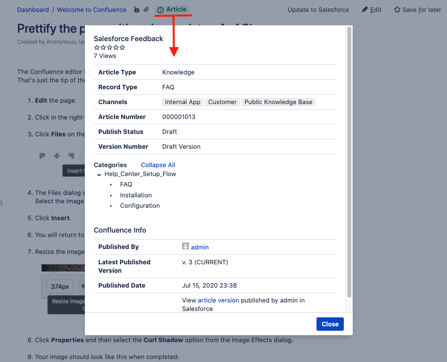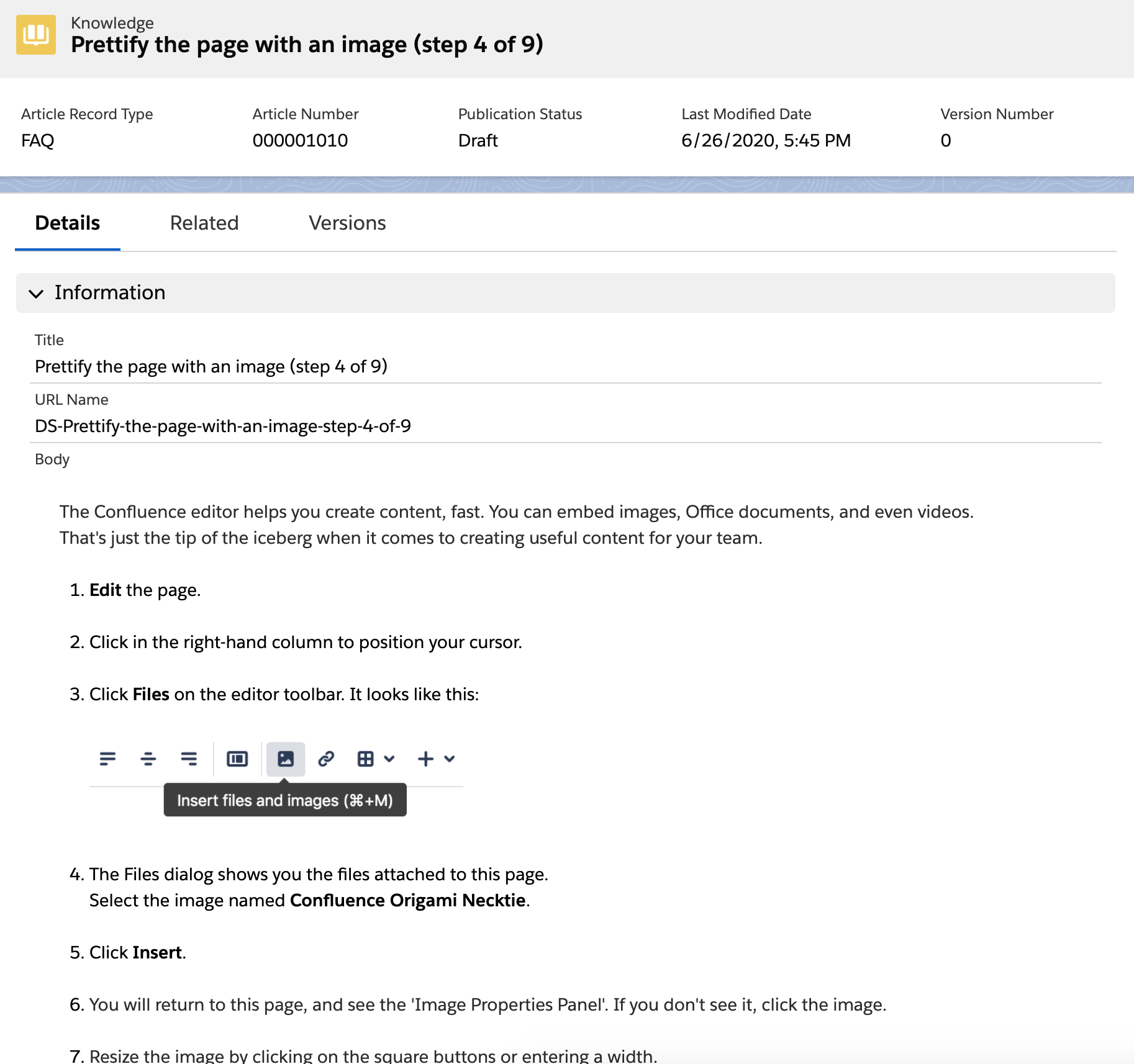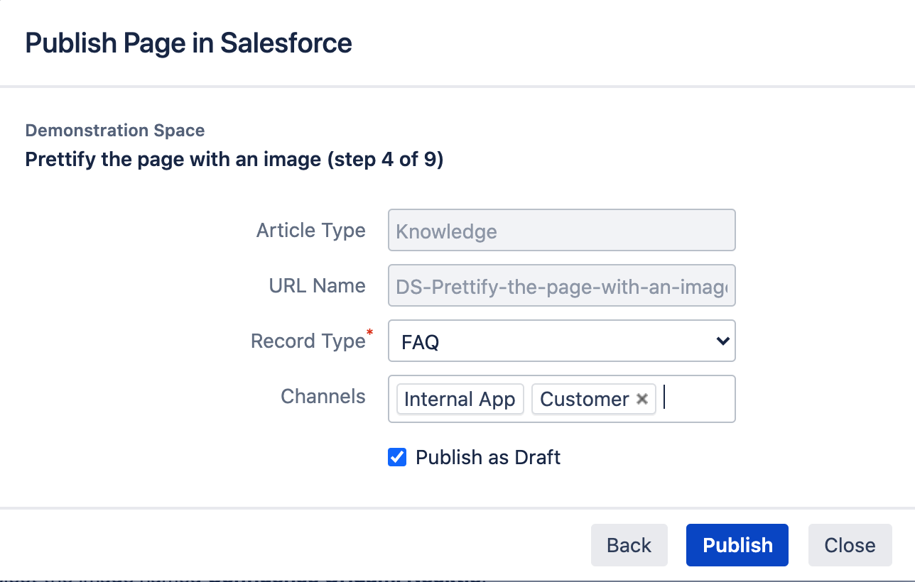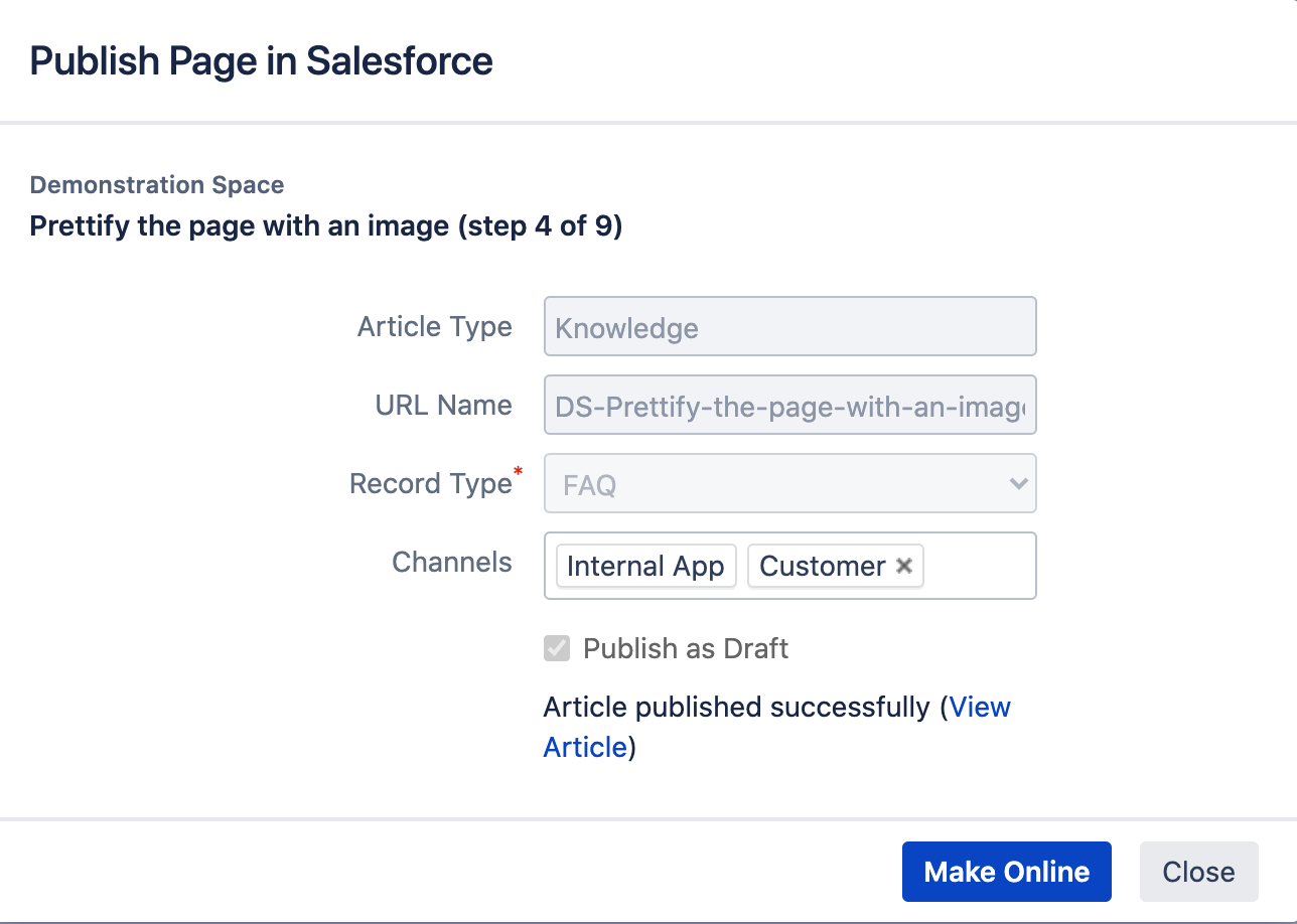 If you choose to publish the page in Draft mode, you may review the published Article in Salesforce via the link provided in the confirmation window, as well as, make the Articles online. It is also possible to review the draft page in Salesforce prior to making it available to online communities.