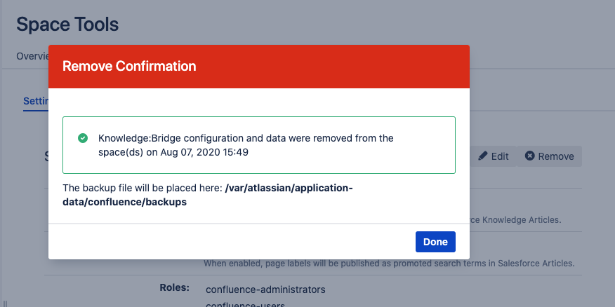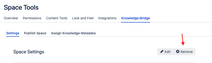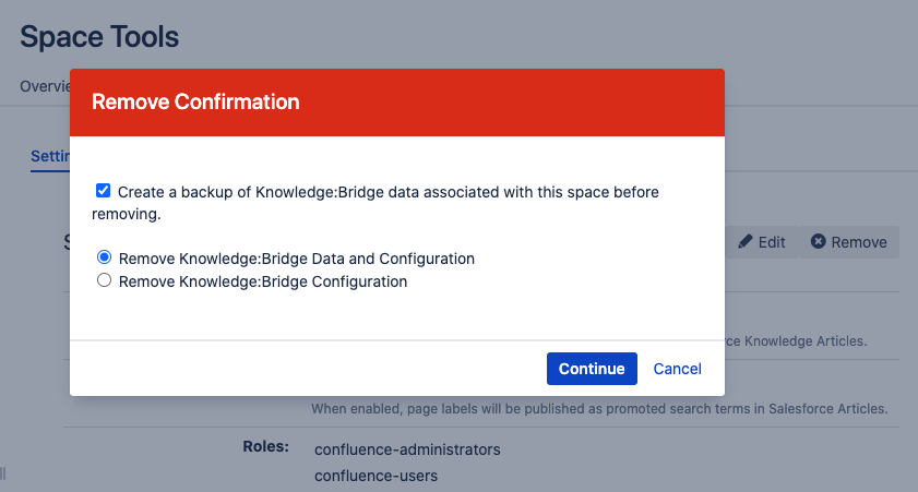It is important to note that the Remove option only acts on Knowledge:Bridge data and configuration. It does not affect space content (pages, etc.).
