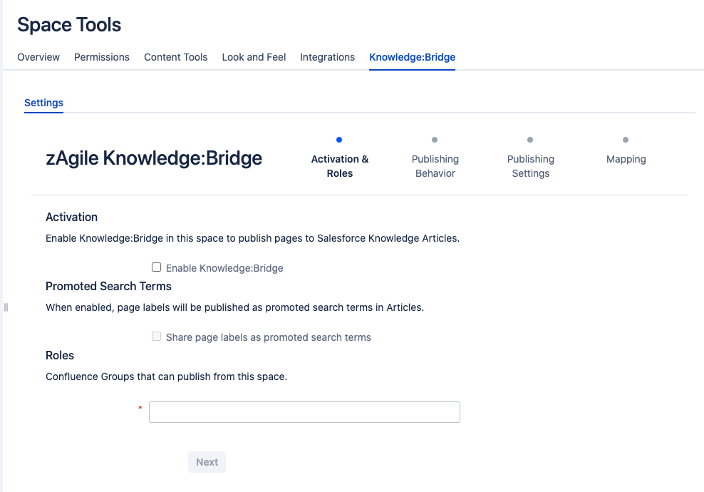 A space previously configured for Knowledge:Bridge can be reset if 1) it is no longer being used to publish pages to Salesforce Knowledge Articles, or 2) if it needs to be reconfigured for Knowledge:Bridge. Knowledge:Bridge provides the Remove option in Space Tools that removes existing configuration and metadata and resets the space so it is no longer active for publishing to Salesforce.