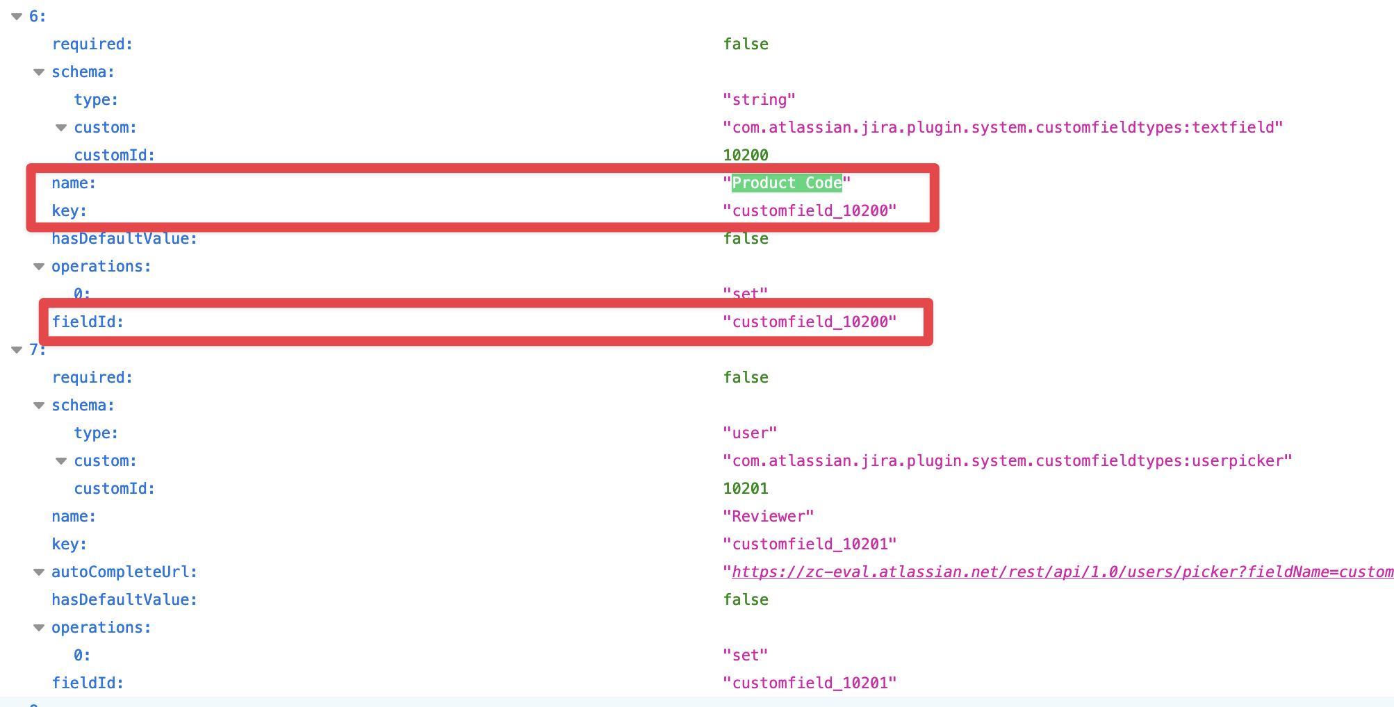 Find the metadata for the custom field by name (Product Code in the example above) in the response.