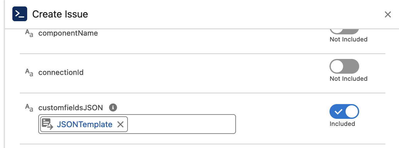 customfieldsJSON | String | To populate custom fields for an Issue, use the field customFieldsJSON in which you can use a formula for building the JSON as string. More details below. | |