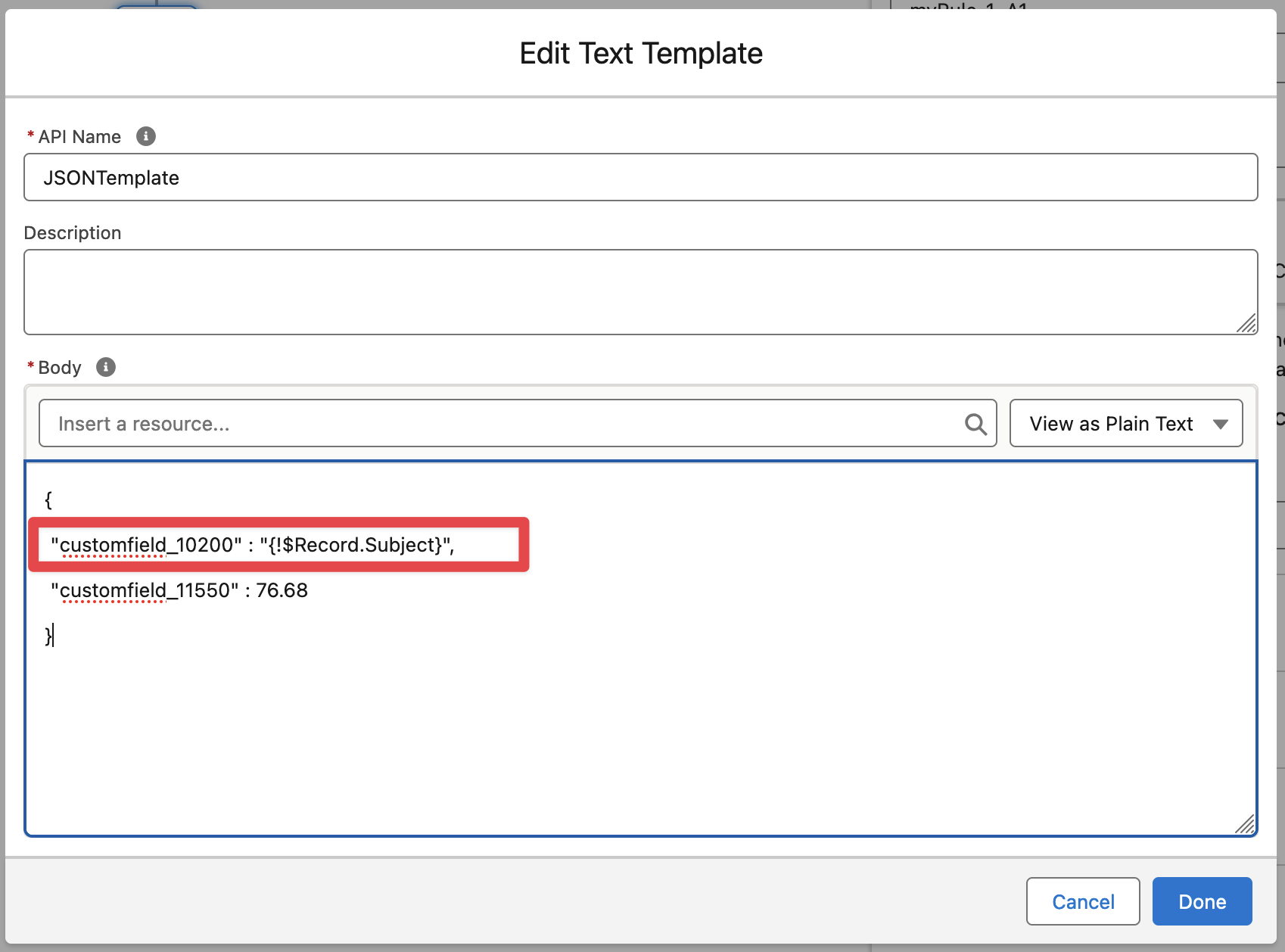 It is also possible pass Salesforce record fields by inserting resources in the text template, for example to pass the Case Subject into the text customfield_10200: