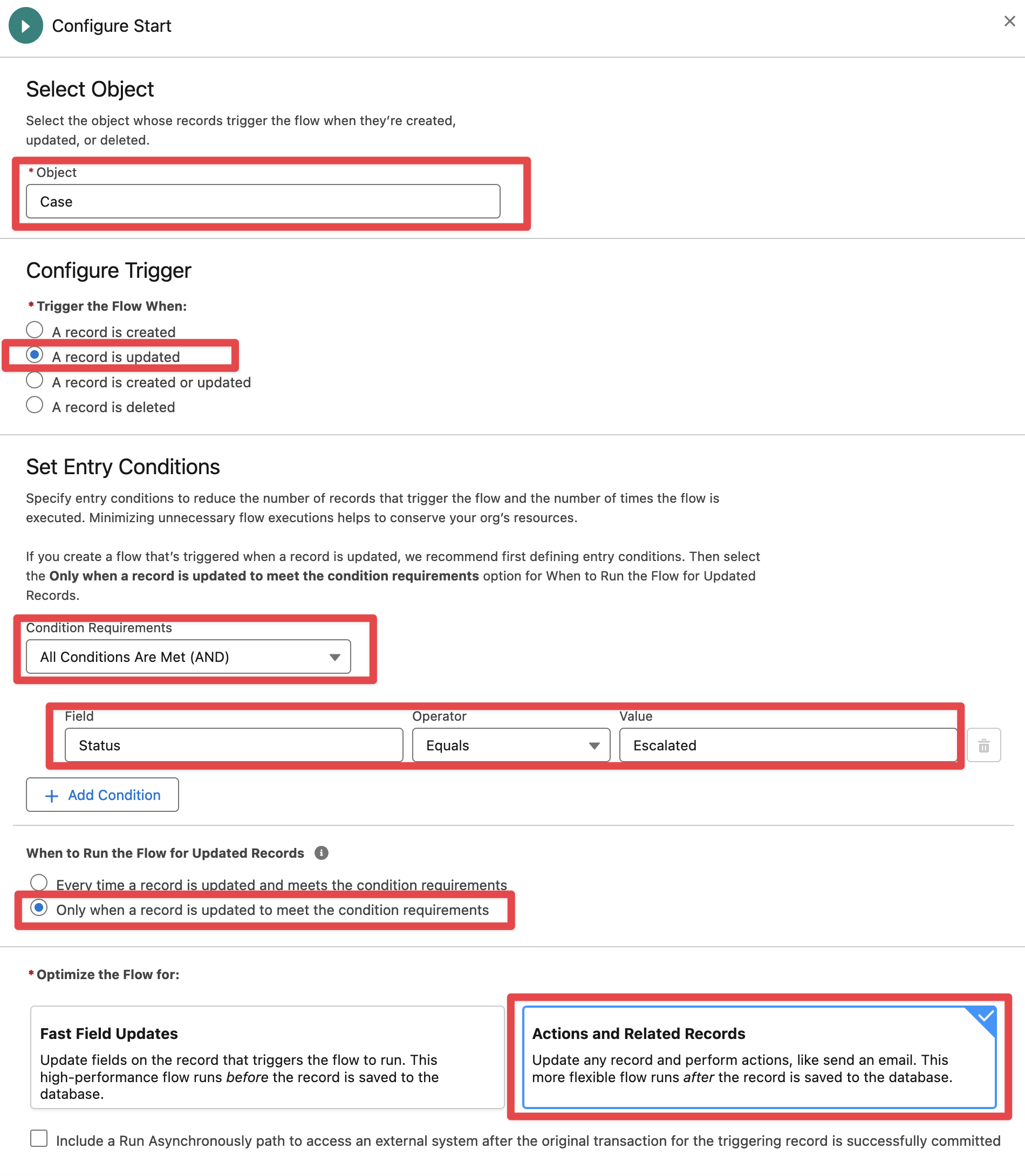 Select “Record-Triggered Flow“ and create, then select the Case Object and the conditions as follows: