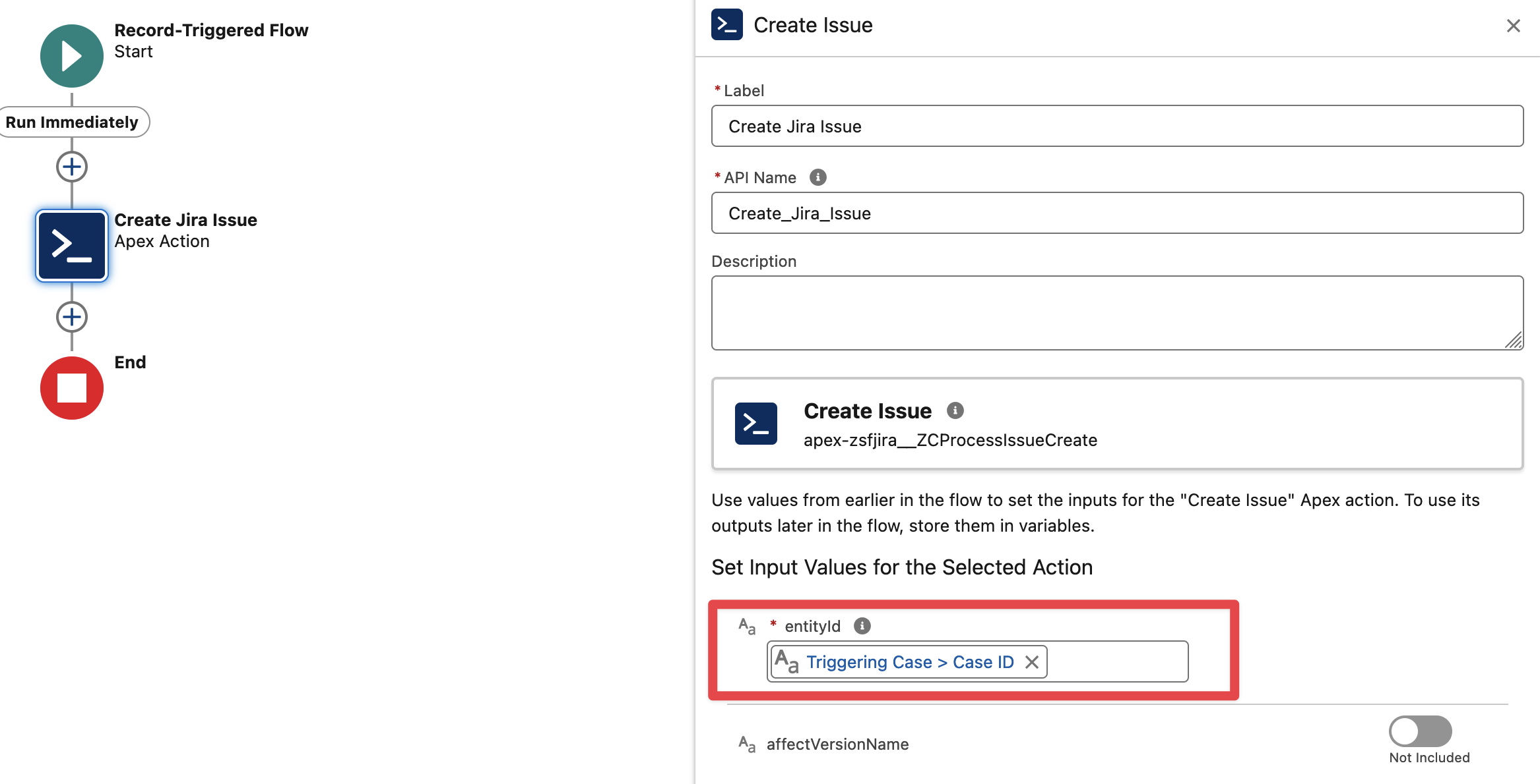 This invocable action executes callouts to Jira API and so is executed in an asynchronous transaction. For this reason this action does not return any result. Errors during Issue creation are sent via email to the Salesforce user for whom the Flow is being executed and will also show in the “Related Jira Issues“ section for the Salesforce record provided (provided as entityId in the Flow Builder).