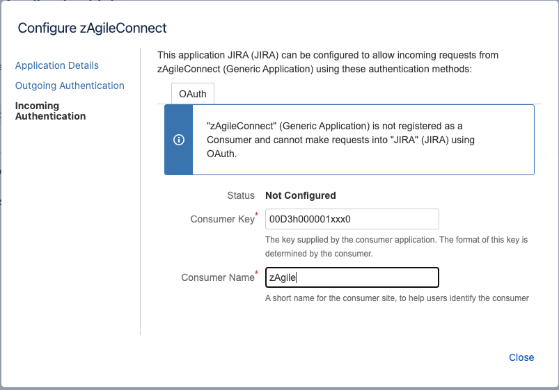 Consumer Key (as shown below) must be the ID of the Salesforce Org which will log into Jira