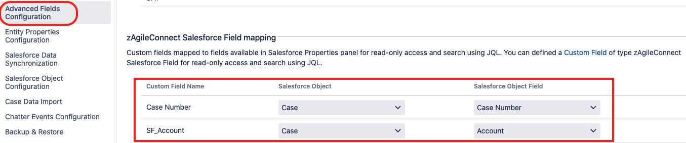These custom fields are mapped to corresponding fields in Salesforce Properties for read-only access and indexing for JQL