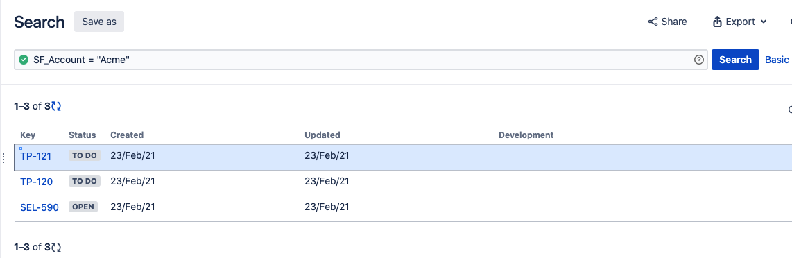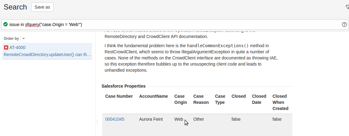 Note that the content inside the double quotes indicates the SOQL criteria, This query will return JIRA Issues linked to Case(s) that have Origin = “Web” .