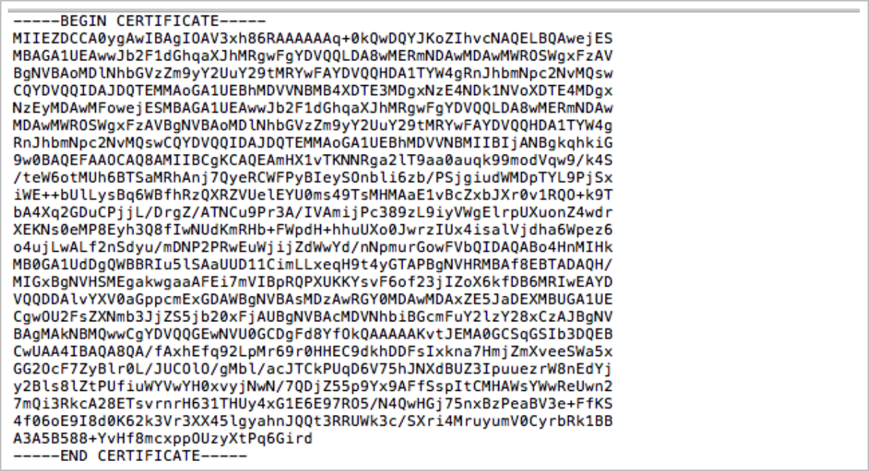 Download the certificate, open it with a plain text editor and copy to the clipboard the entire text content of the certificate, including BEGIN and END tags ensuring that no extraneous or formatting characters are in the content copies here, as shown in the example below.