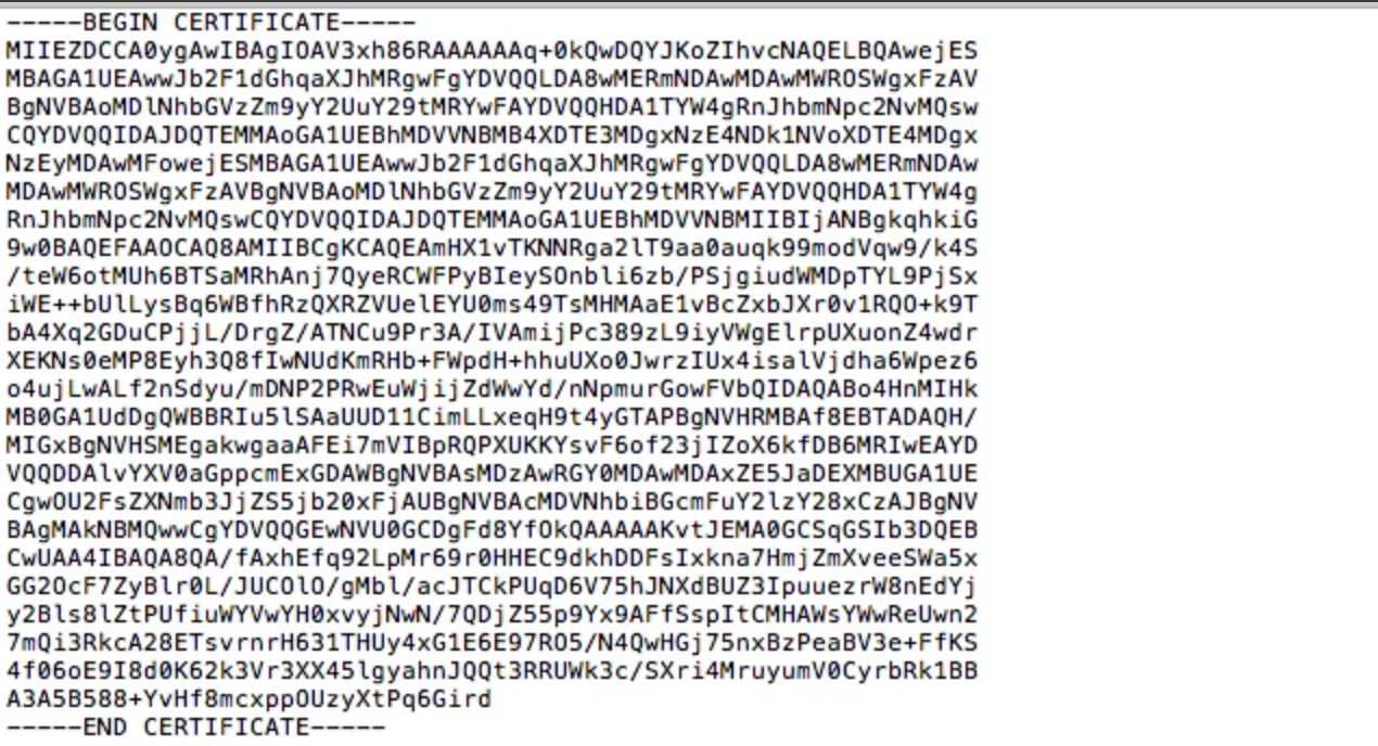 Download the certificate, open it with a plain text editor and copy to the clipboard the entire text content of the certificate, including BEGIN and END tags ensuring that no extraneous formatting characters are in the content here, as shown in the example below.