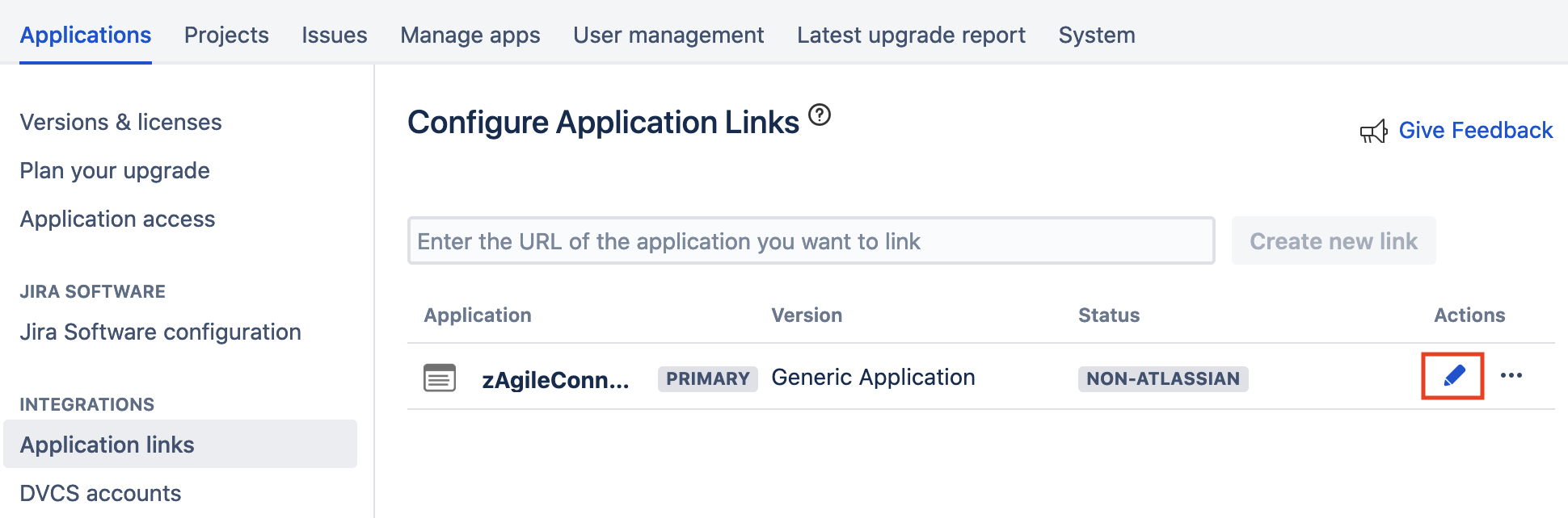 Go to Jira Administration → Products (or Applications) → Application Links and find the Application link created earlier for zAgileConnect.